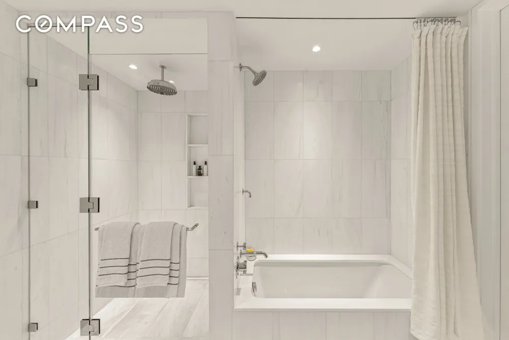 The primary bedroom suite, situated at the far end of the apartment, has east-facing casement windows, a sizable closet plus two additional large closets. A spacious five-fixture en-suite bath, clad in Bianco Dolomiti marble, has white marble radiant heated floors, a marble-clad soaking tub, dual vanity with Kohler sinks and Waterworks fixtures, an oversized marble shower and Toto Neorest commode. The two additional bedrooms, also with east-facing casement windows, have en-suite baths with marble mosaic floors, white oak vanities, Hansgrohe fixtures and wall-hung Toto toilets.