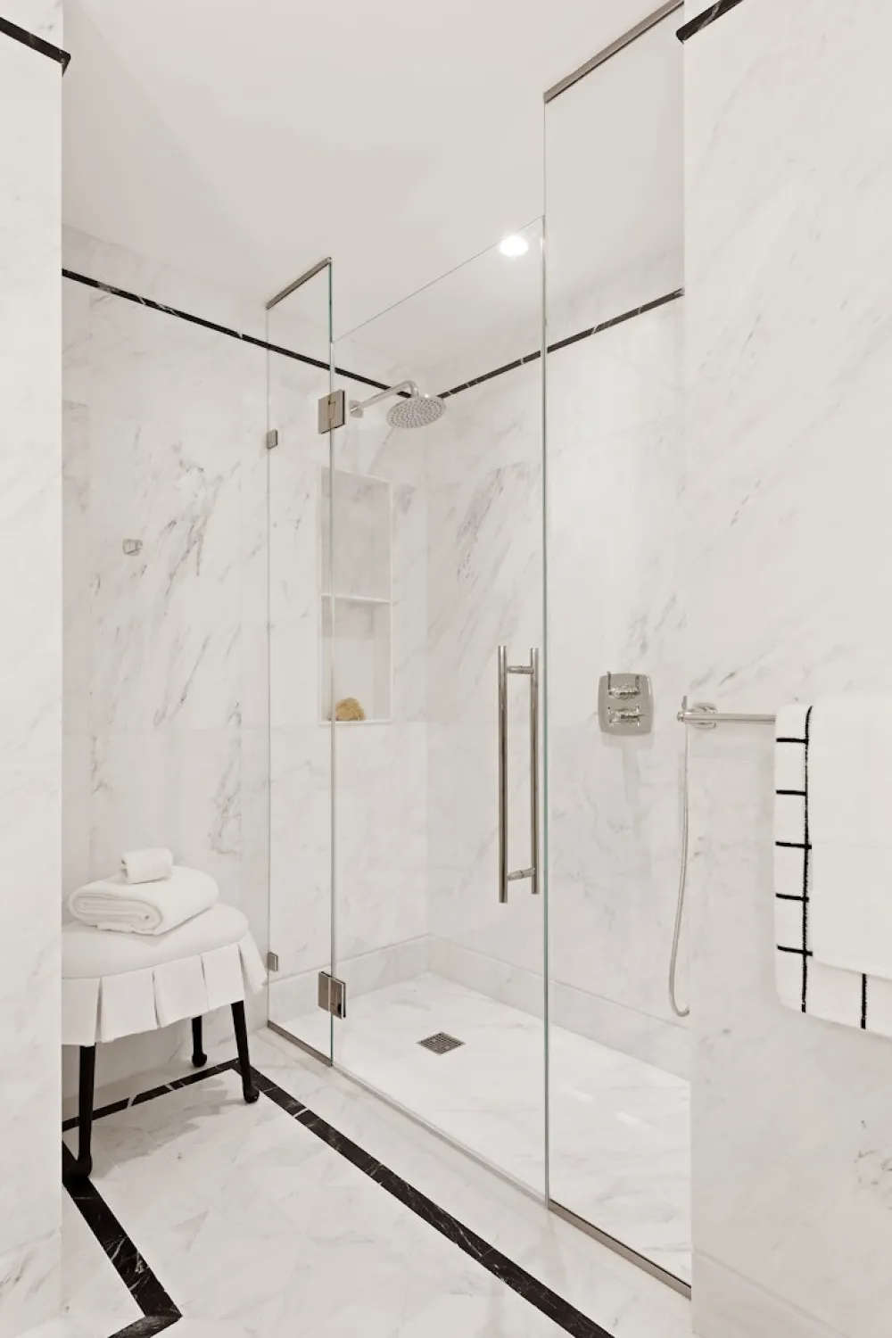 Primary baths feature honed Pacific White Marble, custom white lacquer vanities and Calacatta Black Marble countertops, glass-enclosed frameless walk-in showers and heated floors. Corduroy Deco glazed ceramic wall tiles and Calacatta Gold Marble mosaic floors are found in the secondary baths while powder rooms feature Breccia Capraia Marble slab accent walls and custom light bronze vanities.