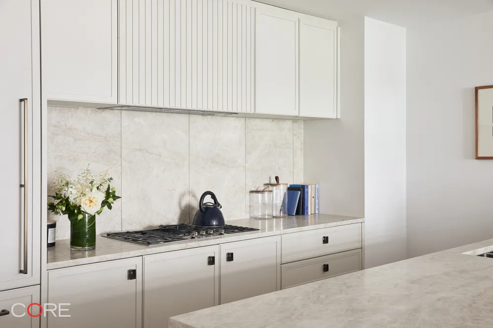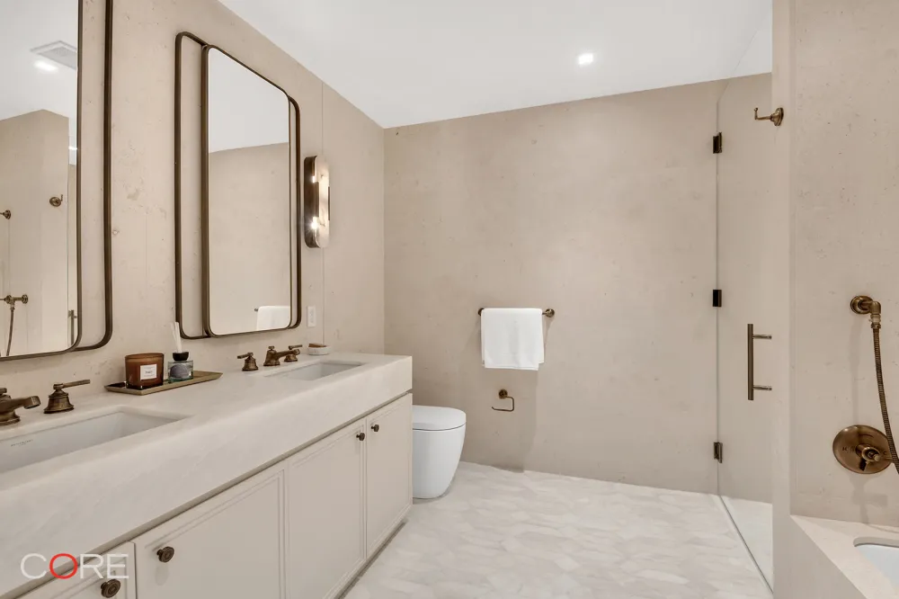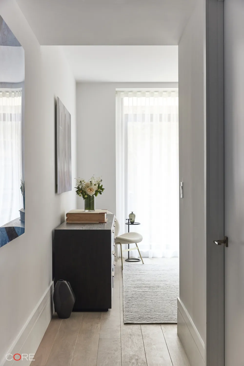 Separated in its own private wing, the primary bedroom is positioned at the south end of the home and overlooks the quaint and charming gardens beneath. The primary bathroom is a sanctuary of refinement, enveloped in Crema Luna limestone complemented by Namibia white marble. Radiant heated floors and high-end plumbing fittings from WaterWorks elevate the luxurious experience. Additional features of this apartment include a separate powder room, white oak flooring, solid core wood doors with Valli & Valli hardware, a side-by-side washer and dryer, and a high-efficiency central VRF system for heating and cooling.