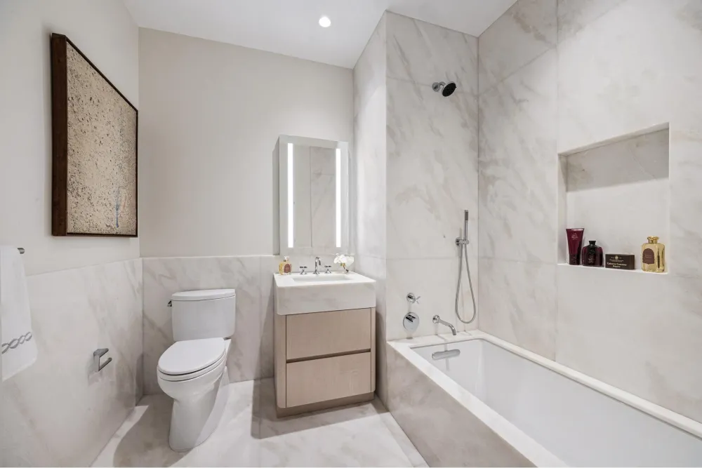 Secondary baths include European Porcelain flooring and walls, custom medicine cabinets with built-in lighting and shelves, and Didimon Light marble vanity with a waterfall design.
