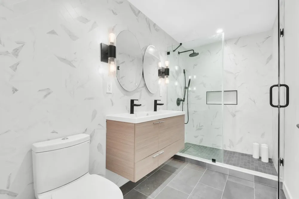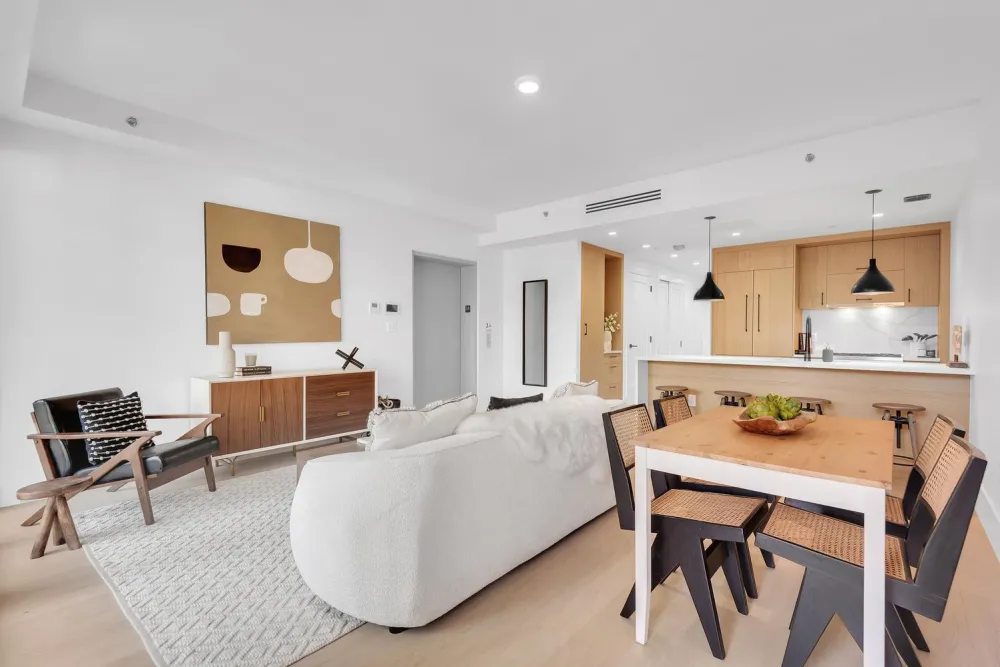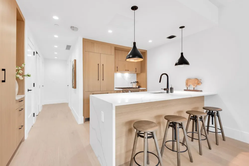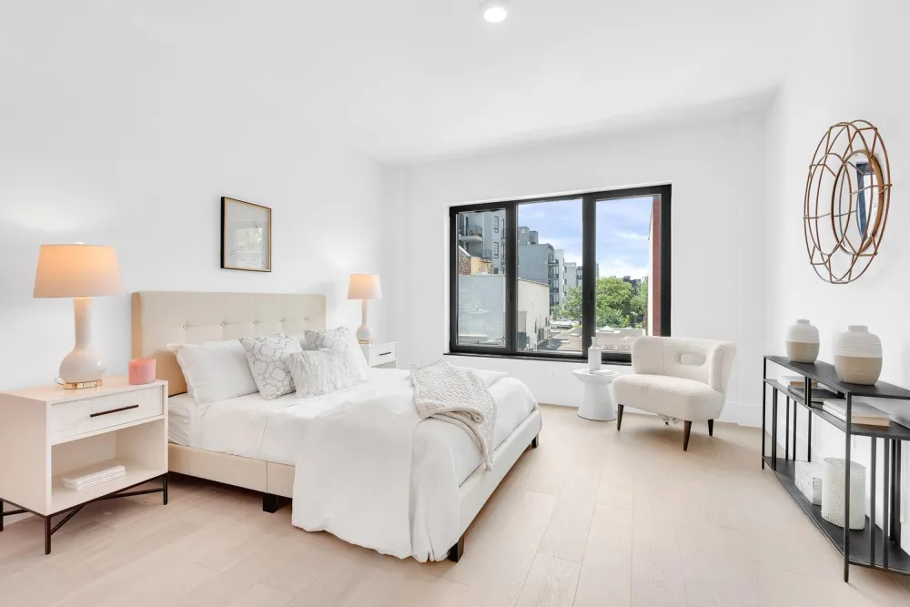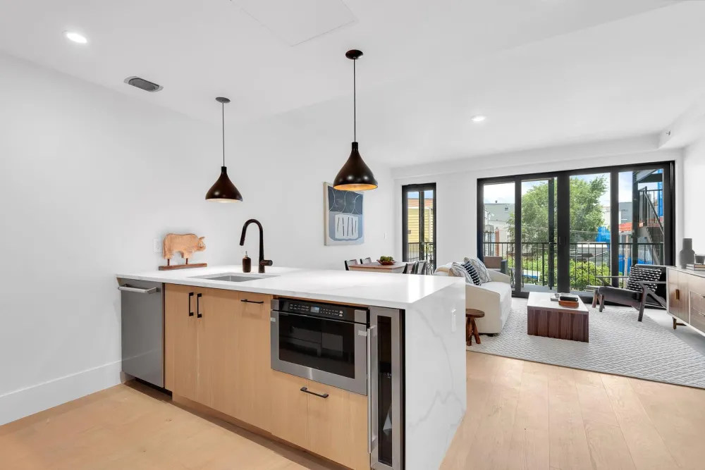 Each unit is a thoughtful blend of attention to detail and open-concept modern living. Features include wide plank European oak floors, a ton of natural light through oversized windows, in-unit washer/dryer, central heating and cooling, lovely bathrooms with chic fixtures and finishes, and spacious modern kitchens featuring Caesarstone countertops and tile backsplash, built in wine fridge, breakfast counter sand high-end appliances from Bertazzoni, Liebherr and LG.