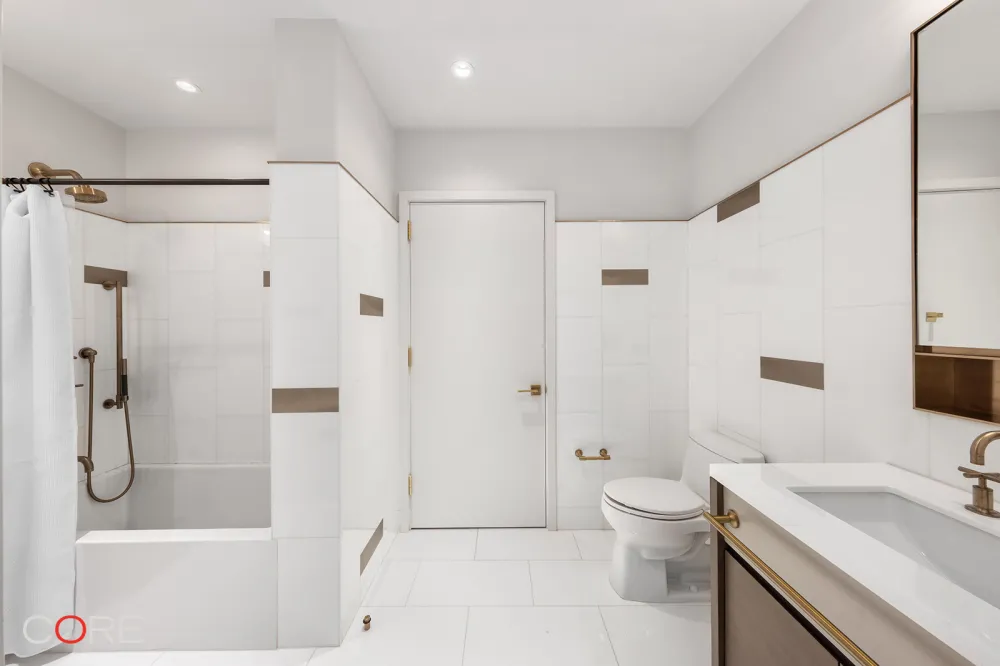 The double-exposed primary suite has four large closets and a luxuriously appointed five-fixture bathroom. Finished with white statuary marble and bronze Kohler fittings, the windowed bathroom boasts a deep-soaking tub and a separate glass-enclosed shower. The full secondary bathrooms are designed with glass wall tile and bronze fittings.