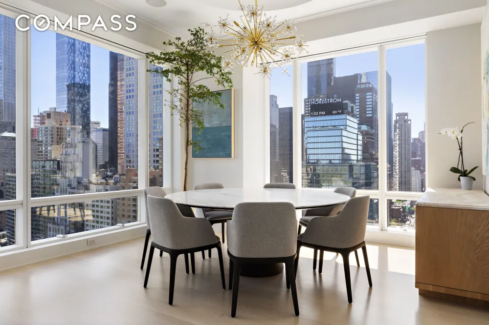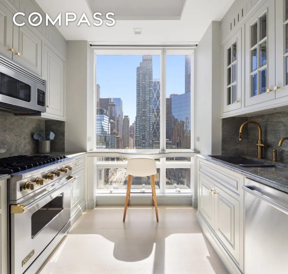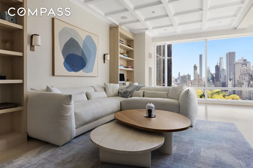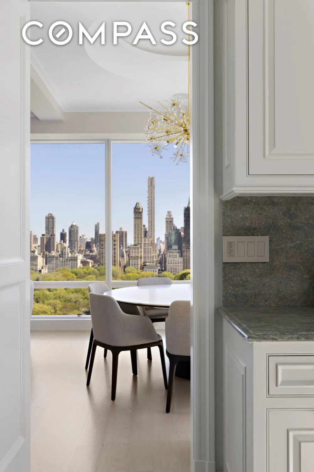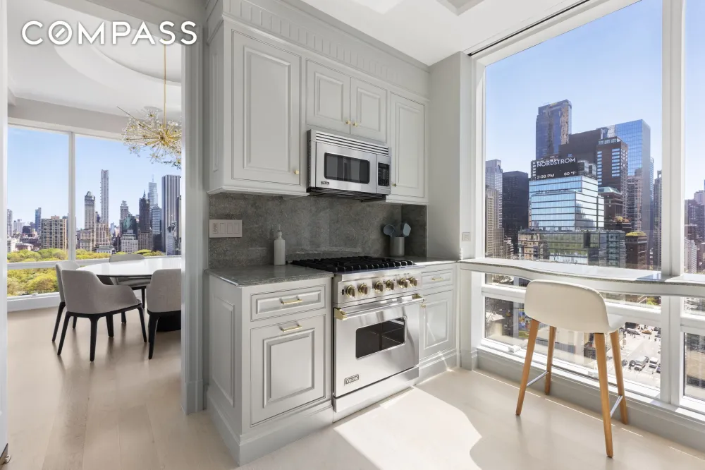 Relax and unwind in the expansive, magazine-worthy living room surrounded by coffered ceilings, wide-plank oak floors and custom white oak built-ins, or plan your next dinner party in the inviting dining room topped by an illuminated cove ceiling and dazzling chandelier. Outside, the dazzling Midtown skyline and Central Park treetops create an unmatched backdrop for lavish entertaining and indulgent daily life. In the work-of-art kitchen, custom gray cabinetry, stone counters and brass hardware flank upscale appliances, including a Bosch dishwasher, Miele built-in coffee system, and a five-burner gas range, wine refrigerator and microwave by Viking. A breakfast counter provides the perfect perch for morning coffee overlooking Columbus Circle.