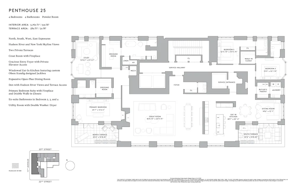 Residence Penthouse 25 spans 5,761 square feet and welcomes you with a gracious entry foyer with private elevator access. With four bedrooms and four-and-a-half bathrooms, the two private terraces make up 584 SF with views of the Hudson River facing west and city skyline views facing north. Complete with two fireplaces, located in the great room and primary bedroom, the expansive, open-plan living and dining areas feature unobstructed views of the Hudson River, warm wood flooring, and floor-to-ceiling windows.