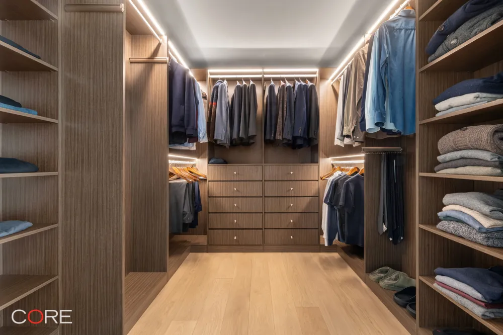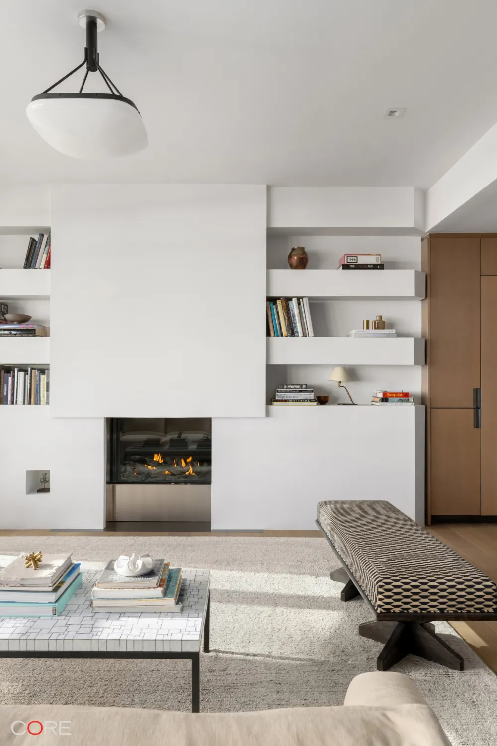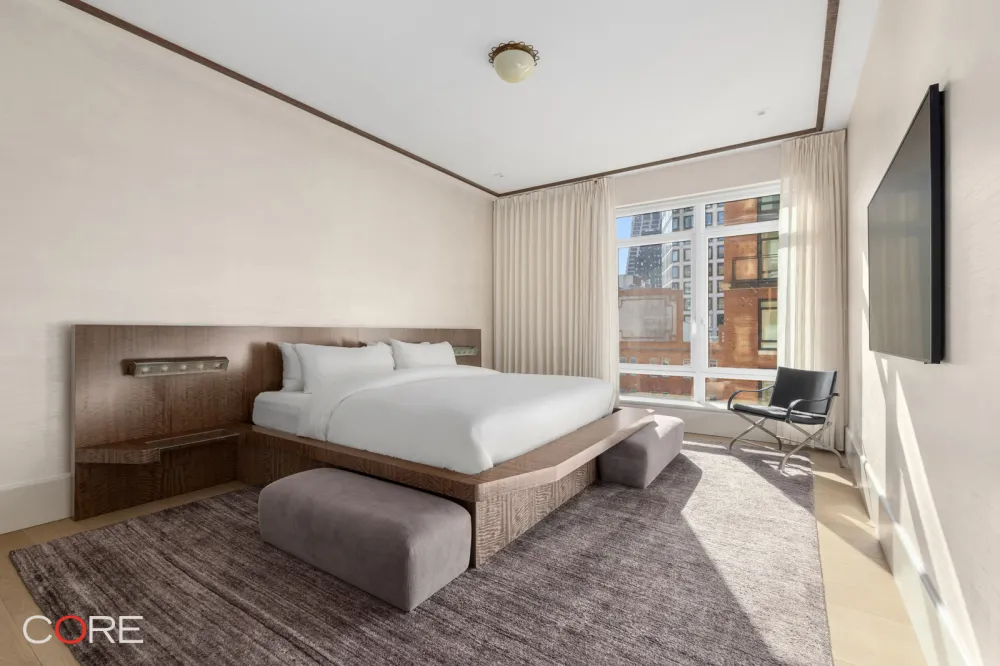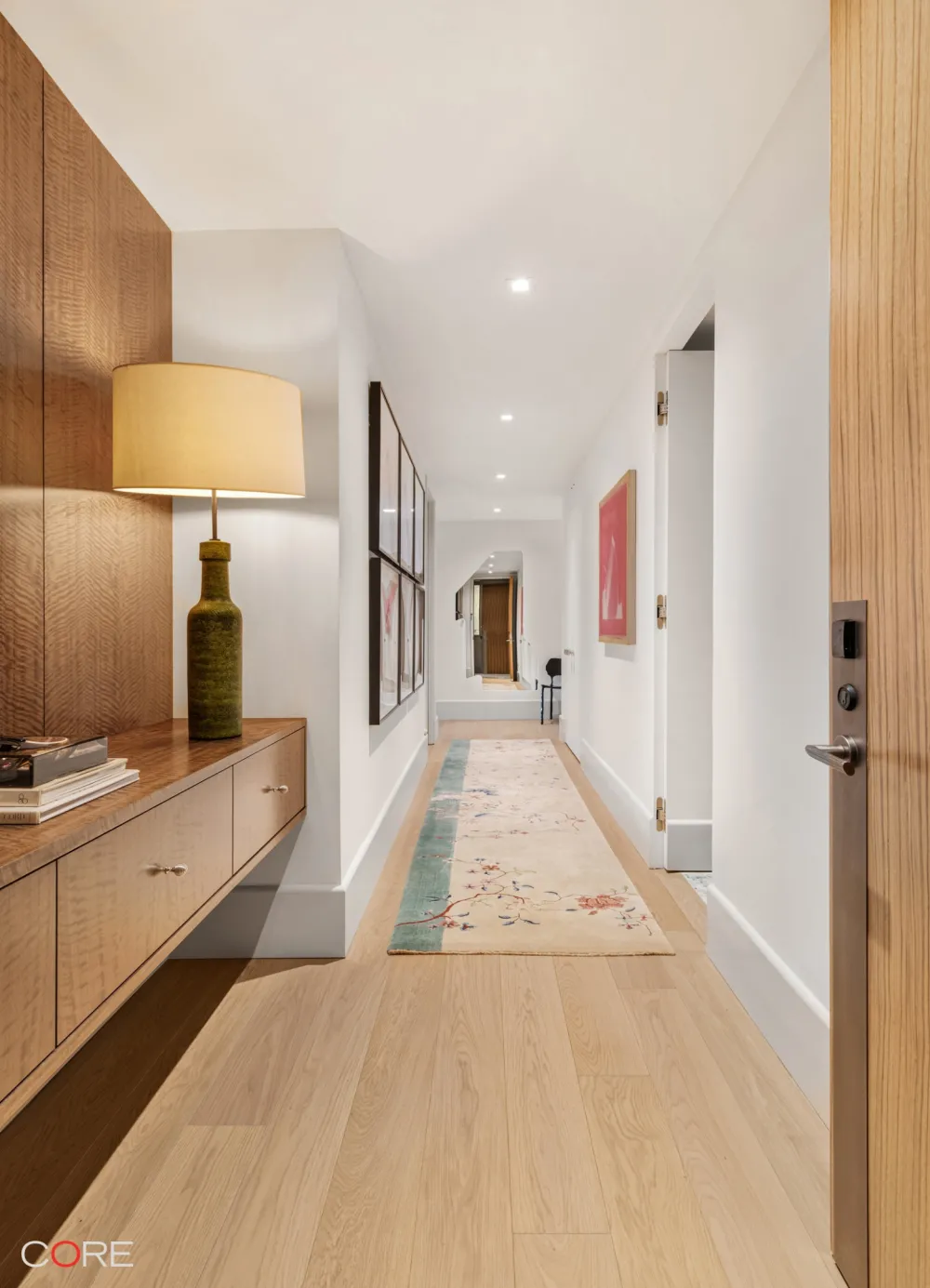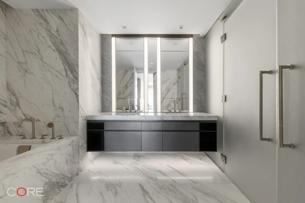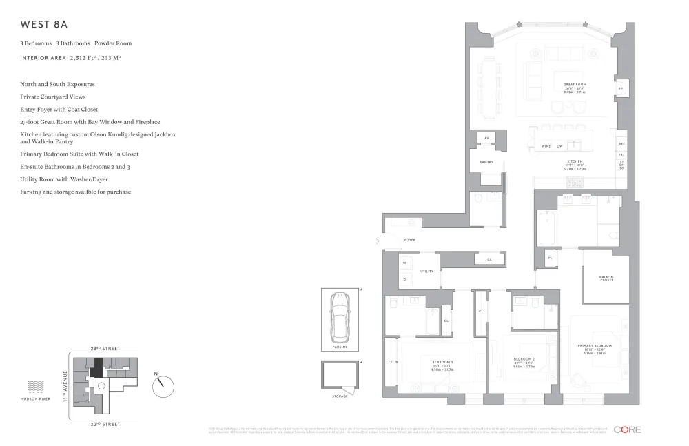 From the moment residents arrive, a sense of grandeur is unmistakable. Unit 8AW spans 2,512 square feet and features three bedrooms and three-and-a-half bathrooms. The expansive, open-plan living and dining areas boast private courtyard views, anchored by a 27-foot corner great room. The kitchen includes a custom Olson Kundig-designed Jackbox and a walk-in pantry, complemented by warm wood flooring and floor-to-ceiling windows. Additional storage and parking are available for purchase.