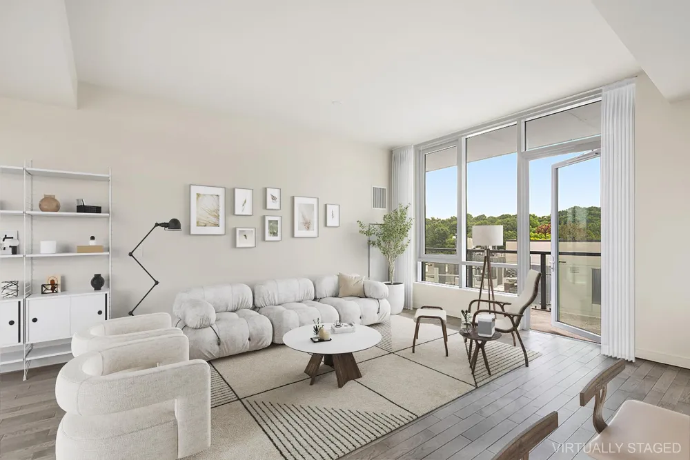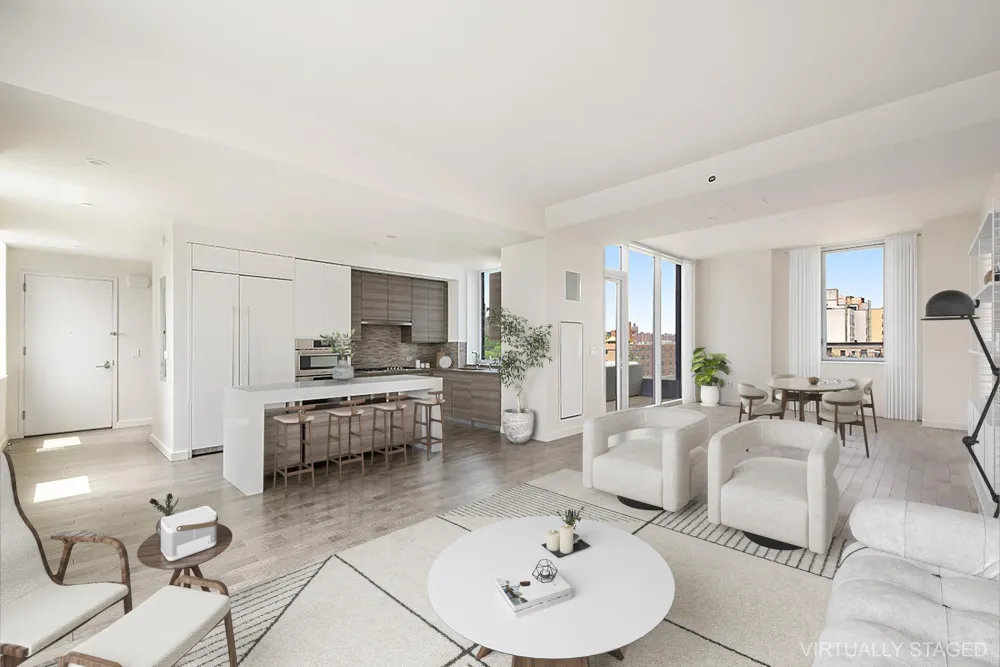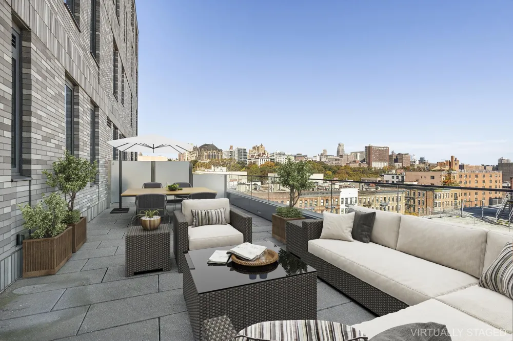 Indulge in the grandeur of the striking 467 square foot terrace, the perfect setting for alfresco dining and sunset soirees. Host gatherings with a built-in gas grill that promises to elevate your culinary experiences to new heights. This unit also features a large balcony with courtyard and park views.