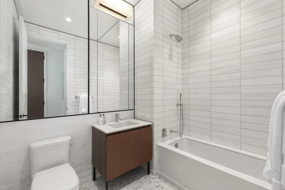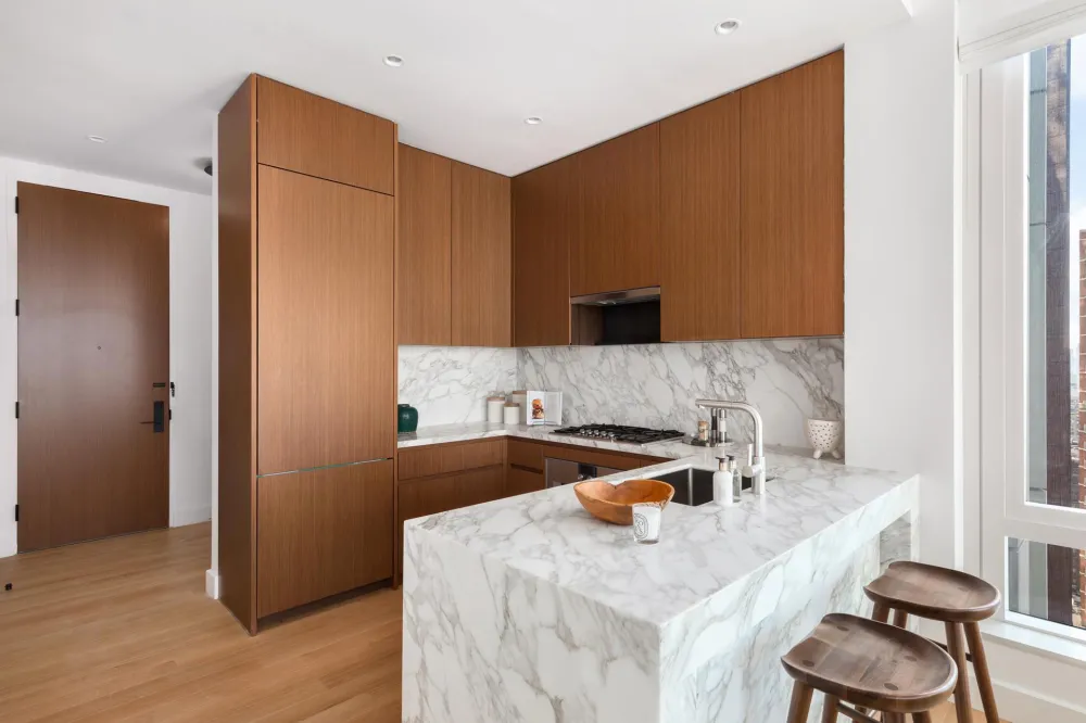 This 1,402 square foot two-bedroom, two and a half-bath residence opens into an elegant entry foyer, leading to a living and dining room encased with 10-foot tall windows with South and West views. Gachot-designed custom rift-cut cabinetry accentuates the open kitchen, with a honed Calacatta Borghini marble waterfall island and backsplash. Gaggenau appliances including a cooktop, combi-steam oven, convection double oven, refrigerator, and wine refrigerator outfit the kitchen. White oak 5-inch plank floors and 9-foot solid walnut doors are featured throughout the residence.