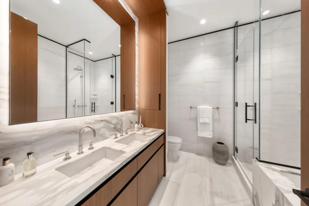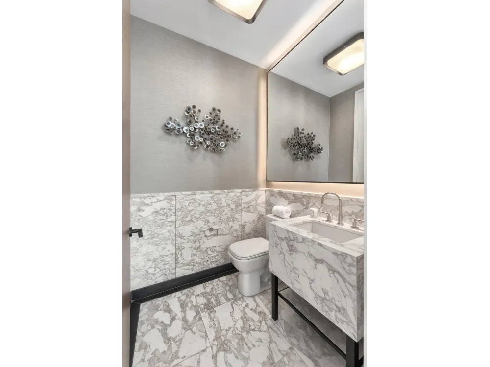 A private vestibule with a gracious walk-in-closet separates the living area from the primary bedroom suite, creating a sense of privacy. The en suite master bath offers honed Bianco Dolomiti marble on the walls as well as floors, which are heated, with a custom Gachot-designed vanity and mirror. Platinum matte Dornbracht fixtures accentuate the vanity, Kaldewei tubs and Durivit toilet. A striking powder room with honed Calacatta Nuevo and Absolute black marble walls complemented by a Gachot-designed custom vanity with Dornbracht fixtures is situated thoughtfully off the entry foyer.