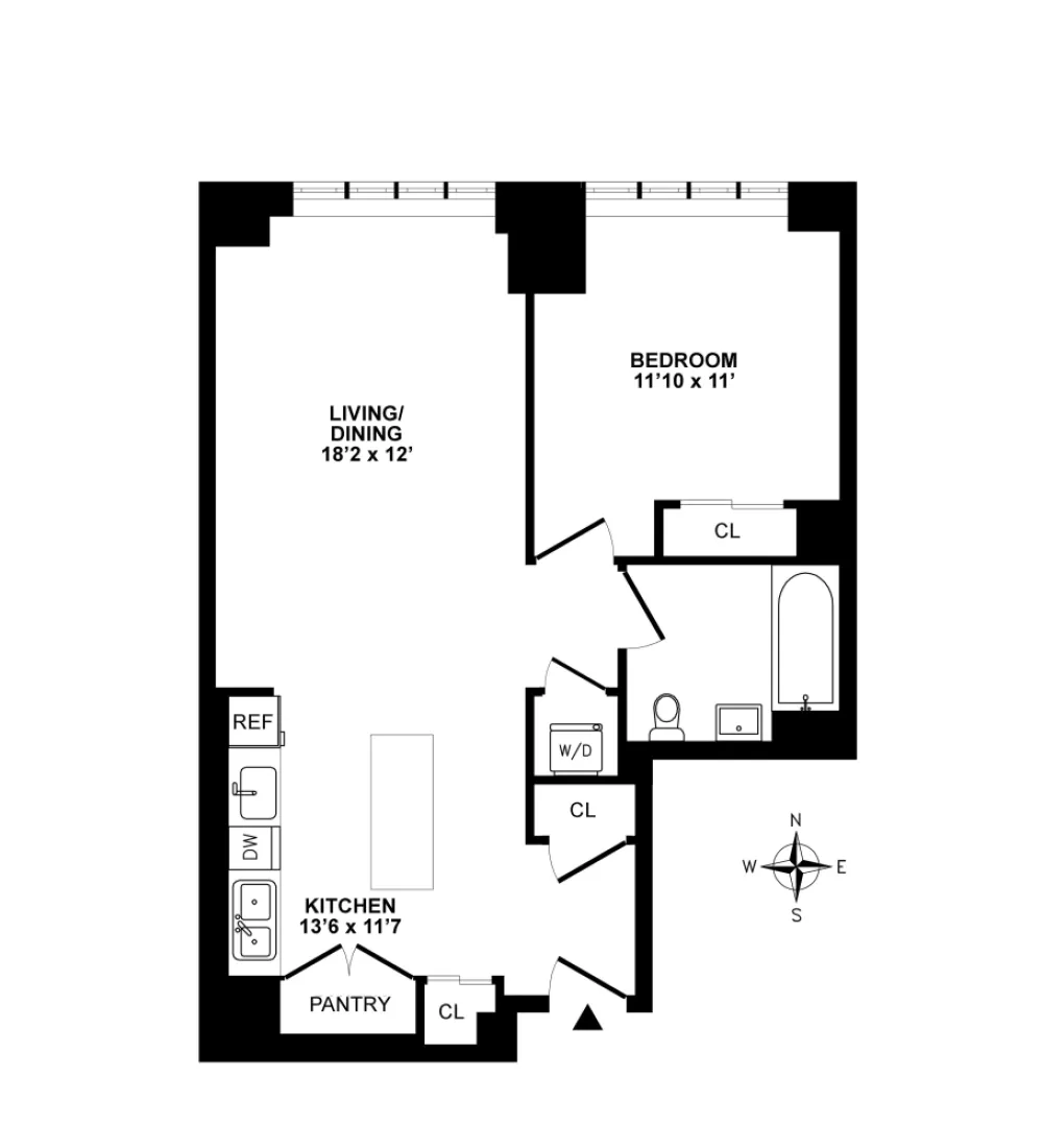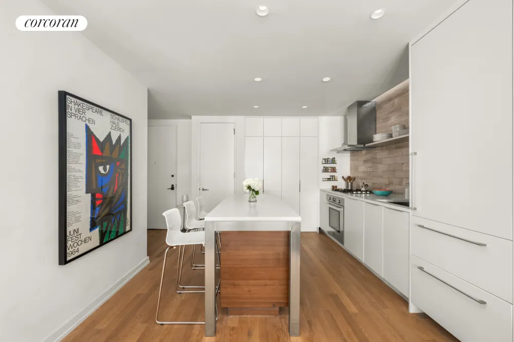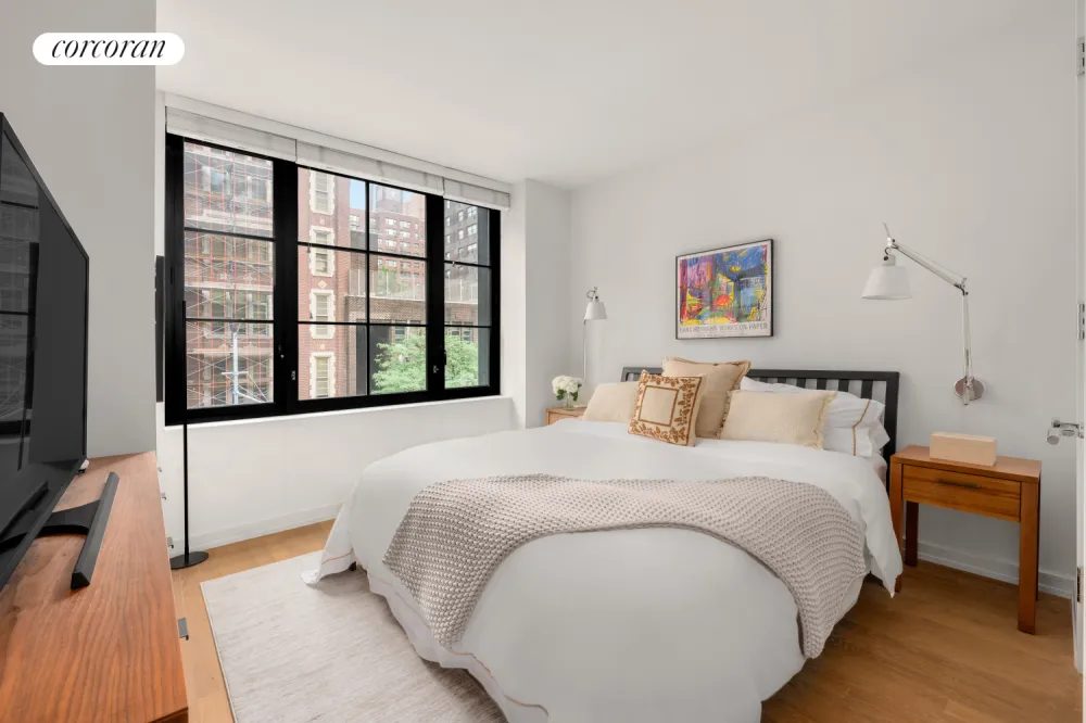 Live in the heart of Gramercy in this spacious and modern loft-like one-bedroom, one-bathroom home. Bright and airy with floor-to-ceiling industrial style casement windows adding a warm and cool atmosphere to the space, high ceilings and a perfectly integrated open living/dining room with a designer gourmet kitchen featuring quartzite stone surfaces, a silver travertine stone backsplash, Sub-Zero fridge/freezer, Bertazzoni oven and gas cooktop, and Bosch dishwasher and a movable stainless steel island. There is also a generous kitchen pantry and storage cabinets.