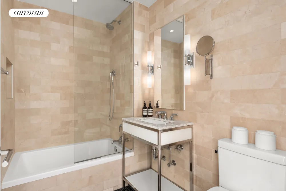 The luxurious bath boasts a Kohler bathtub, stone tiled floors and walls, performance polished chrome Waterworks fittings, and a custom-made vanity crafted with Carrera marble. Beautiful solid white oak floors and a Bosch washer and dryer complete this unique residence.