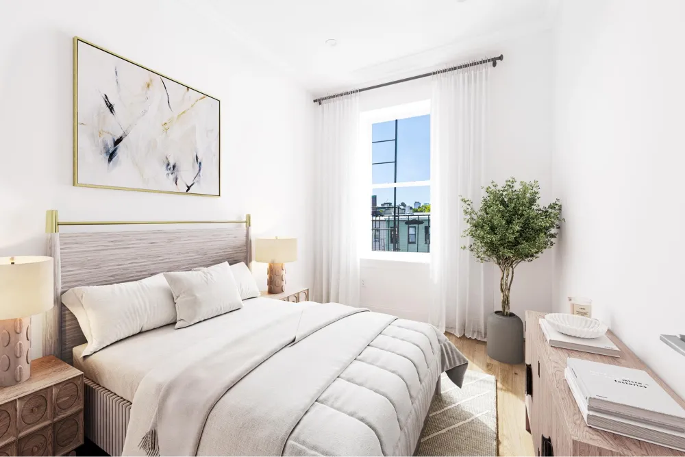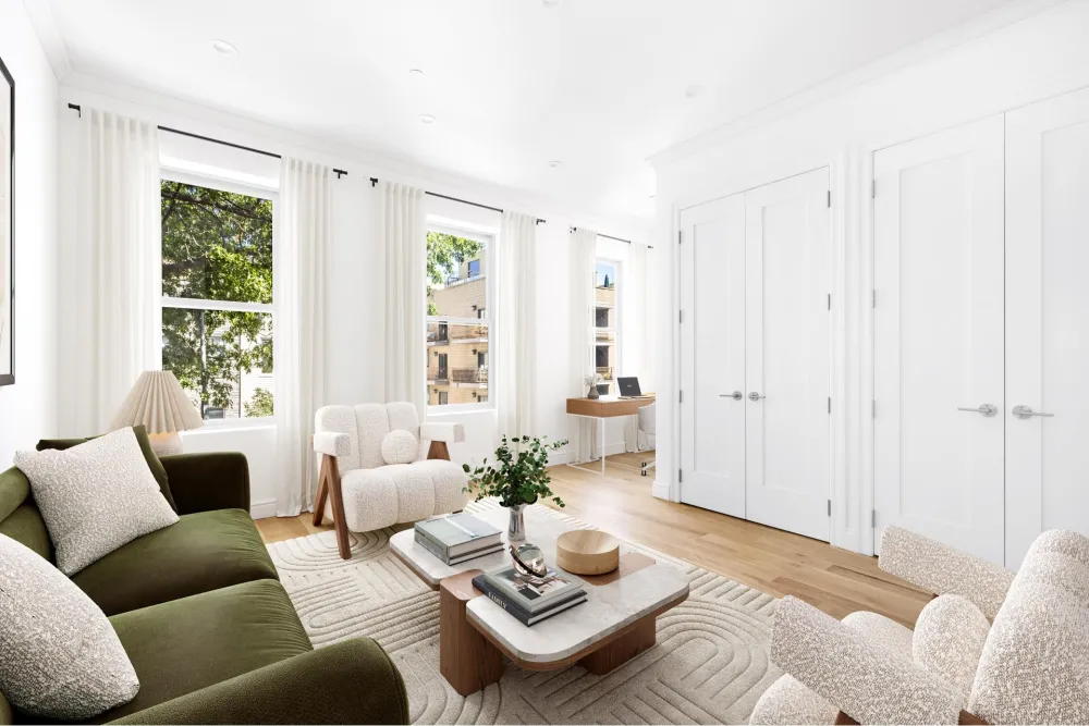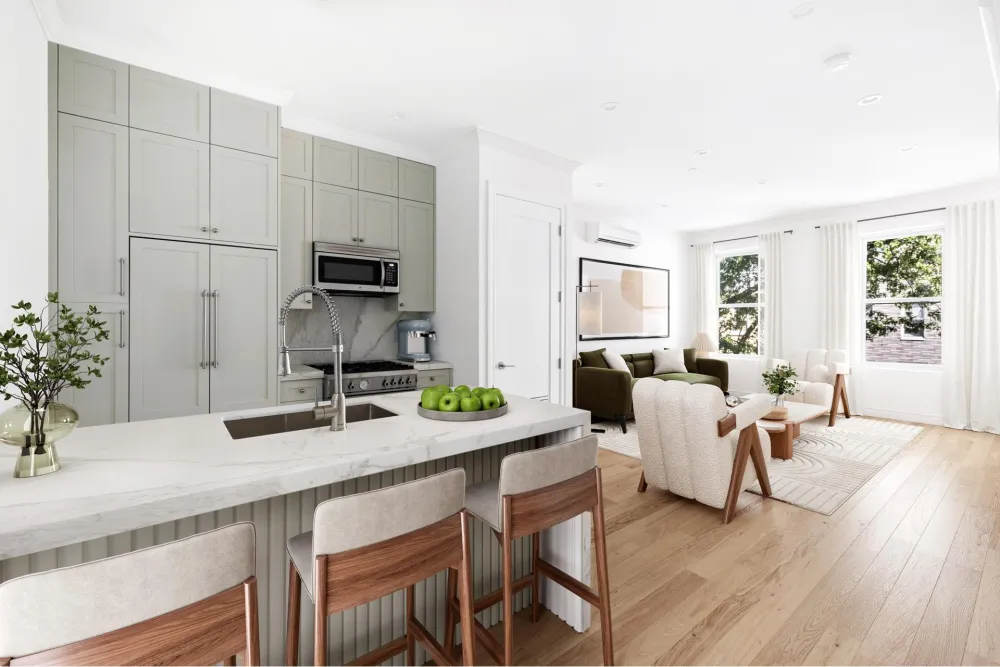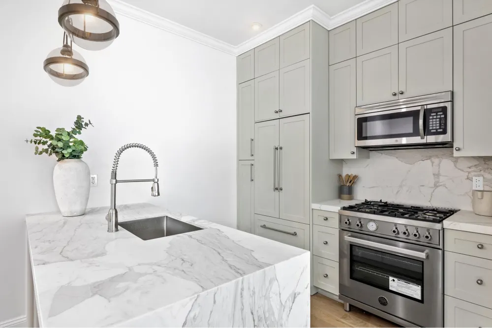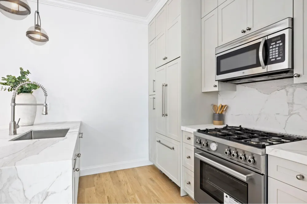 The luxurious 2-bedroom / 2-bathroom floor-through layout boasts over 9-foot ceilings beautifully framed with crown moulding. The thoughtful touches and impeccable artistry harken back to a bygone era of craftsmanship. The 5-inch-wide white oak hardwood flooring spans throughout the living space adding a touch of warmth.