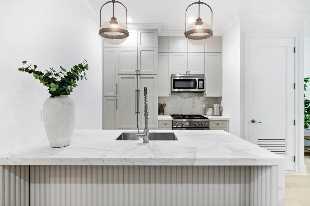 The kitchen is made for a foodie. A clever layout coupled with multilevel storage capacity keeps the workspace fully functional. The timeless custom solid wood shaker cabinets feature Calcutta gold marble countertop with a deluxe Bertazzoni gas range and paneled Fisher & Paykel with Bosh dishwasher package. Combined with the dedicated dining room area, this space is ready to entertain.