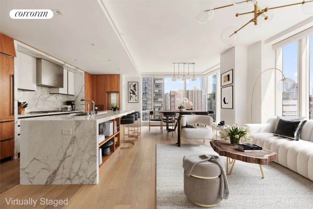 The apartment boasts a spacious layout, with a rectangular living room that opens up to a custom Scavolini kitchen designed by Jeffery Beers. The kitchen comes with top-of-the-line Wolf, Sub-Zero, Gaggenau, and Miele appliances, Dornbracht fixtures, and walnut cabinets with a light oak finish and white matte glass. The Vagli Fine Vein marble countertops and backsplash add an air of sophistication to the space.