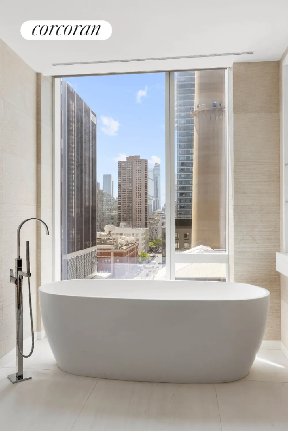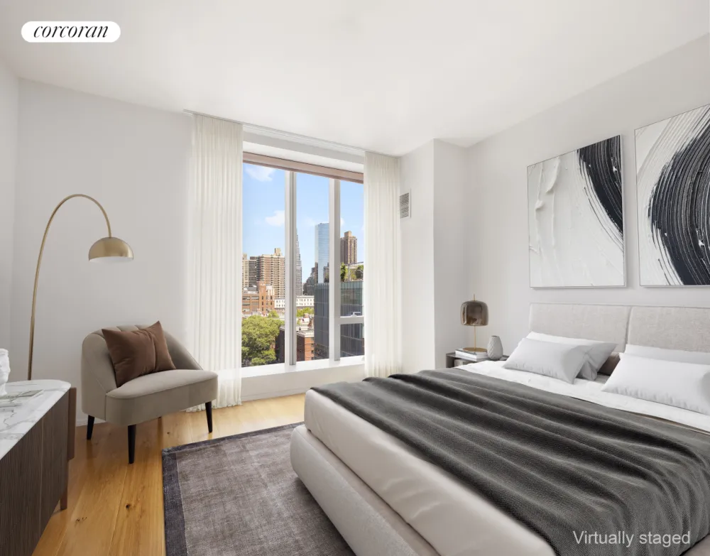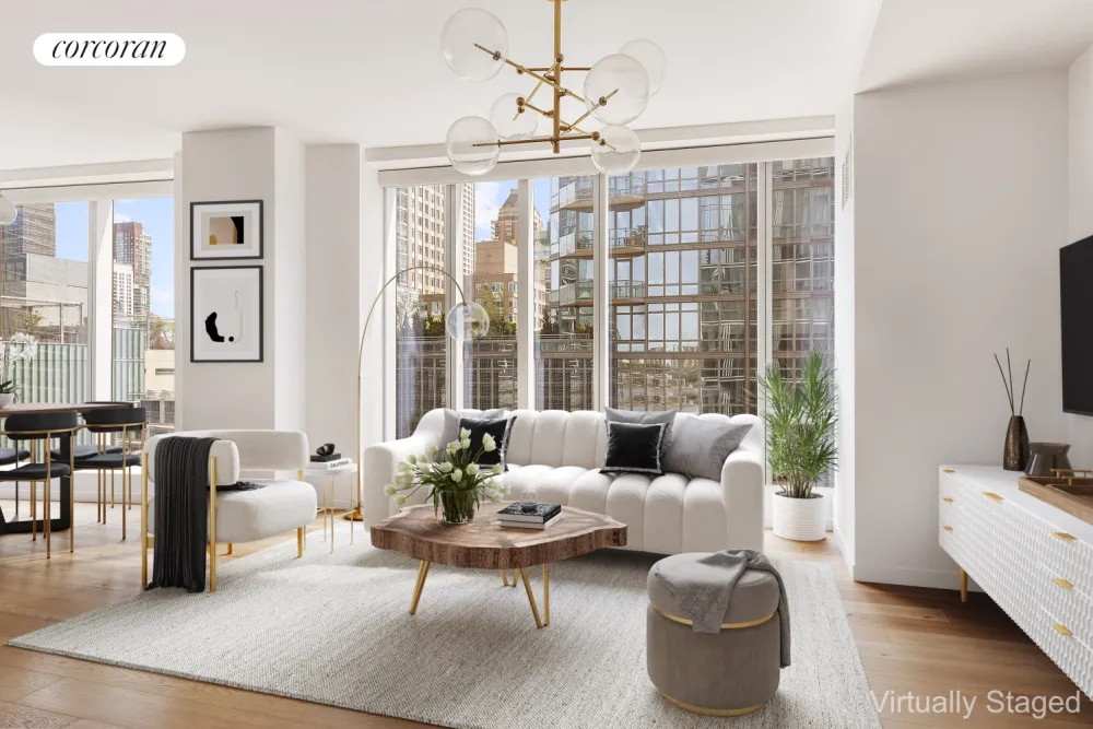 This apartment is filled with natural light from the floor-to-ceiling windows, which offer open city views and three exposures - East, South, and North. The apartment features walnut wide plank floors, a 4-pipe fan coil HVAC system for year-round temperature control, and a washer/dryer for convenience.
