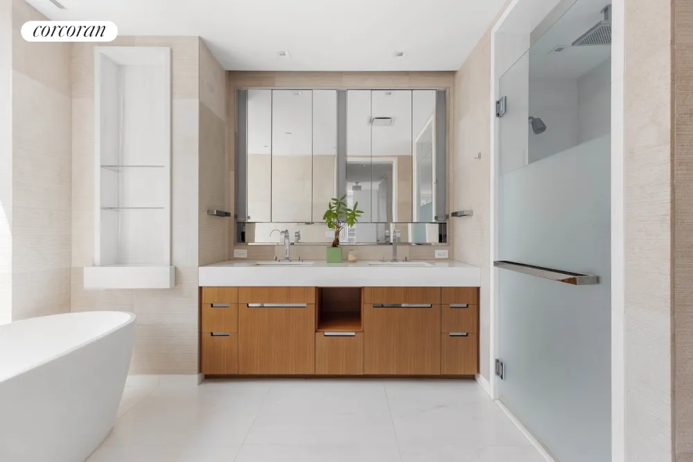 The master bathroom features heated Bianco Dolomiti marble floors and countertops, brushed limestone walls, a glass-enclosed shower, and a Zuma soaking tub. The secondary bathrooms boast Opal White marble floors and walls, a custom-stained oak vanity with a Lacava countertop, and Dornbracht fixtures. Recessed medicine cabinets with LED lighting complete the hotel-like experience.