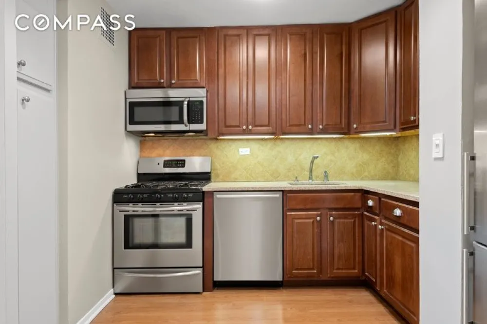 The sunny apartment features a functional kitchen with stainless steel appliances. A breakfast bar/island can easily be installed. The extra long living room can easily accommodate dining and entertaining furniture. The bedroom alcove can easily fit a queen bed. The bathroom has been updated with modern fixtures. Two large closets throughout the apartment. Air conditioning is through the wall. The super low maintenance includes water, heat and cooking gas.
