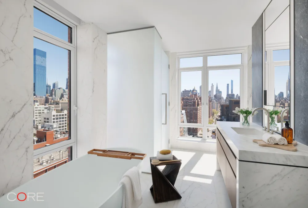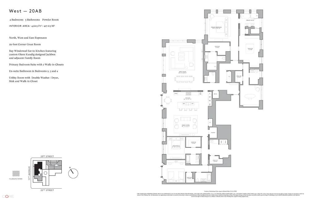 Residence 20AB is 4,603 SF with four bedrooms and five-and-a-half bathrooms. The expansive, open-plan living and dining areas feature unobstructed views of the Hudson River, a 29-foot corner great room, a windowed eat-in kitchen with a custom Olson Kundig-designed Jackbox, warm wood flooring, and floor-to-ceiling windows. The primary bedroom suite features two walk-in closets connected to two full bathrooms. Each of the additional bedrooms is complete with an en-suite bathroom. A utility room with a double washer/dryer, sink, and walk-in closet tie into a secondary entry point.