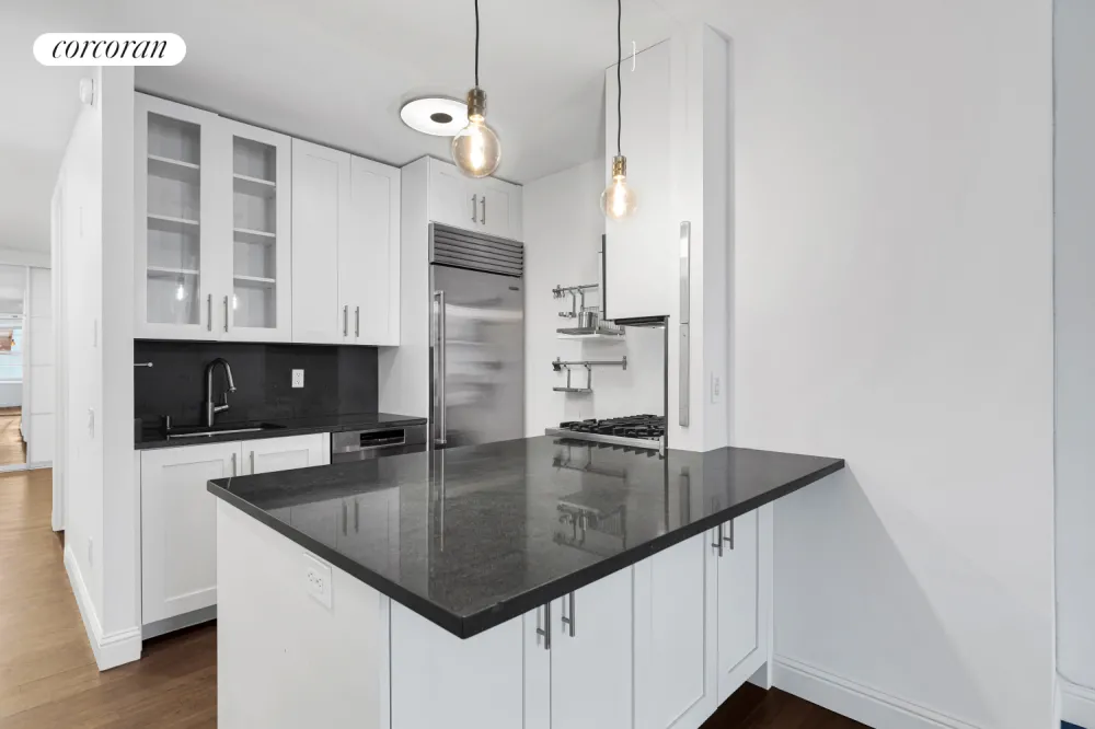 Upon entering the home, you'll be greeted by a wall of professionally built out closets for all of your storage needs. Next you'll encounter the sleeping area, which is a large enough for a queen-size bed and nightstands. As you continue toward the living space, you will find the fully renovated bathroom on your left with medicine cabinet, storage shelving, and rain shower head. The open concept kitchen has also been fully renovated and includes a Sub Zero refrigerator, Viking range and microwave, Bosch dishwasher, and breakfast bar with additional cabinets for storage.