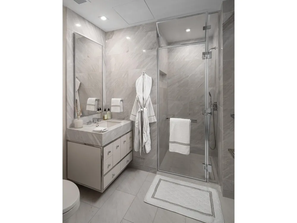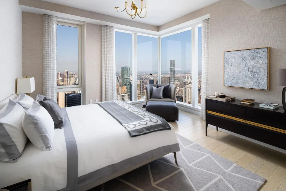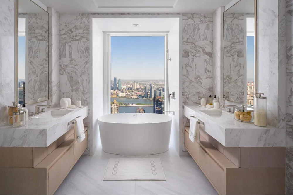 On the opposite side of the Great room are the private quarters. The private cornered primary bedroom with 10 ft floor to ceiling windows facing East and North creates a beautiful and serene retreat. The primary bedroom also has an extra-large WIC. The five-fixture primary bath offers Bianco Dolomiti radiant heated flooring underfoot, an enclosed shower, and a Victoria + Albert free-standing tub. A custom double vanity with white oak, rift-cut wood veneer millwork, and Marno Illusion countertops is completed with a built-in medicine cabinet, Kallista Sink and Dornbracht Fixtures. The two additional well sized ensuite bedrooms feature floor to ceiling windows with open views to the east, south, or north. An additional fourth bedroom can also function as an office, library, or TV room boasts stunning open views to the North and views of Central Park and beyond.