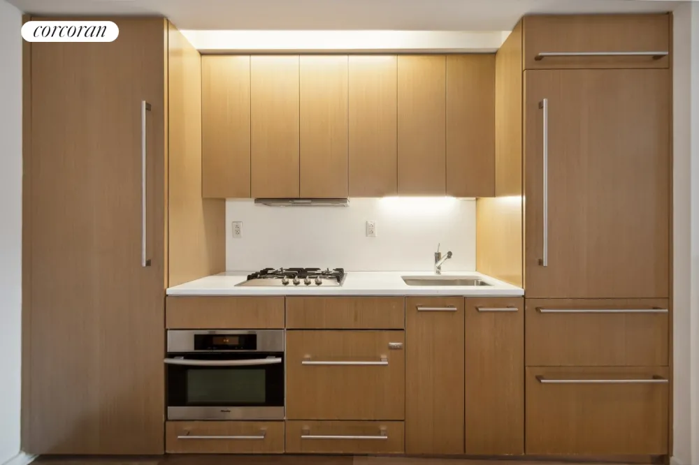 This exceptional high-rise studio is not to be missed! Featuring floor-to-ceiling double-pane windows with northern exposures, it offers stunning views and ample natural light. The open kitchen boasts a Sub-Zero refrigerator with double door freezer, Miele microwave-oven combo, and Fisher & Paykel dishwasher. The bathroom is adorned with Philippe Starck signature fixtures and floor-to-ceiling white Thasos marble. Additional highlights include a large walk-in closet, re-finished floors, and an in-unit washer/dryer, making this an incredible home.