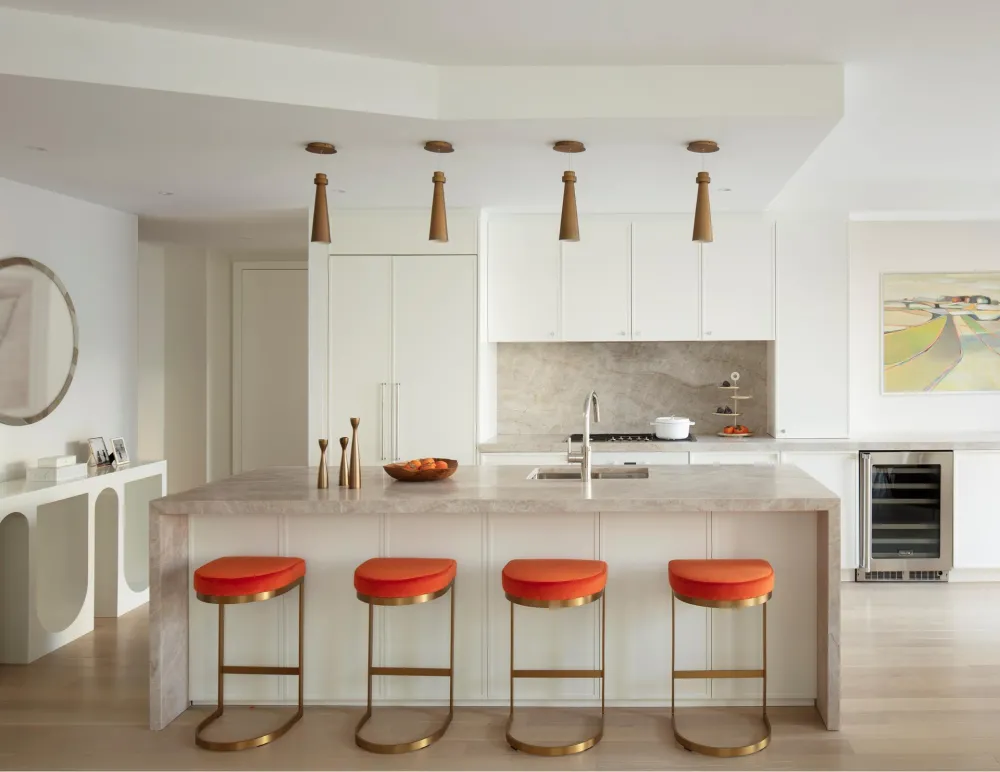 The custom CetraRuddy-designed open kitchen is outfitted with white matte lacquer cabinetry, honed quartzite slab countertop and backsplash, and a full suite of Miele appliances. The oversized kitchen island features a quartzite countertop and waterfall edge that provides ample seating space.