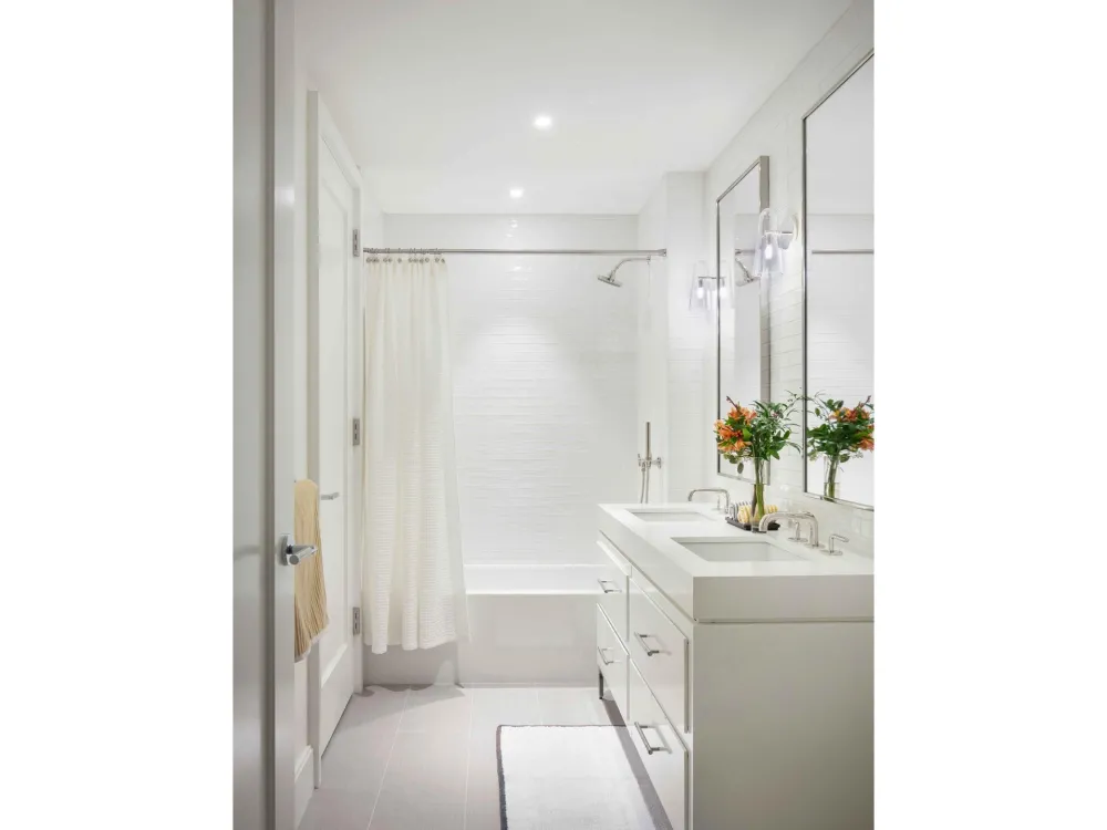 The additional bedrooms offer generous closet space, while the additional baths combine matte grey floor tile with high-gloss white ceramic wall tiles, white matte lacquer vanities, and brushed nickel fixtures by Waterworks. The fourth bedroom makes for a perfect home office or guest room.