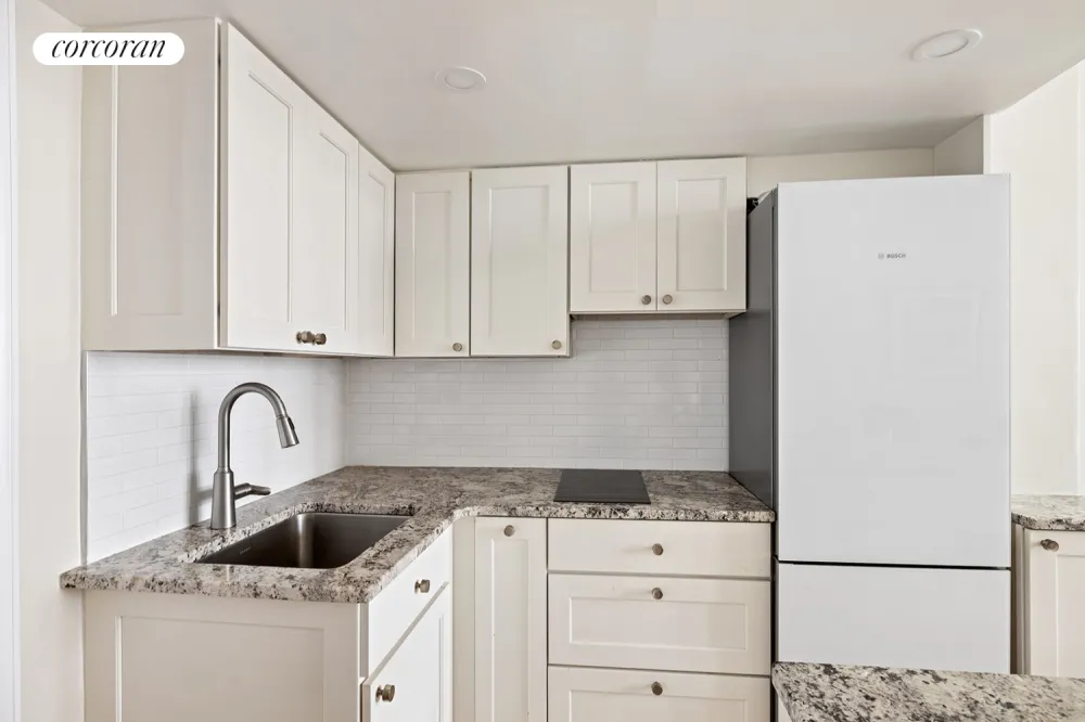 The kitchen is a chef's delight, complete with granite countertops, a full-size refrigerator, abundant cabinet space, and a spacious center island that doubles as a dining area, fitting 3 to 4 bar stools. The renovated bathroom is elegantly designed, featuring modern fixtures including a rain show head, beautiful tile, stone backsplash, and ample storage.