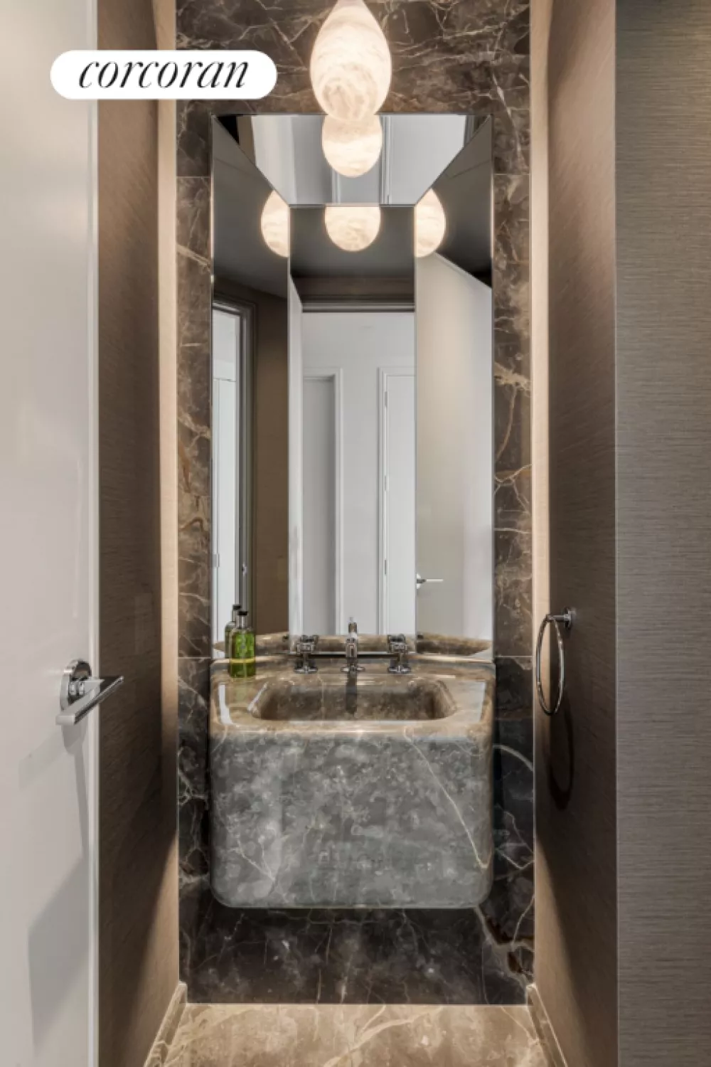 The striking focal point of the one-of-a-kind dramatic powder room is its' sink carved from a single block of Fior di Bosco marble with accent marble walls and floors.