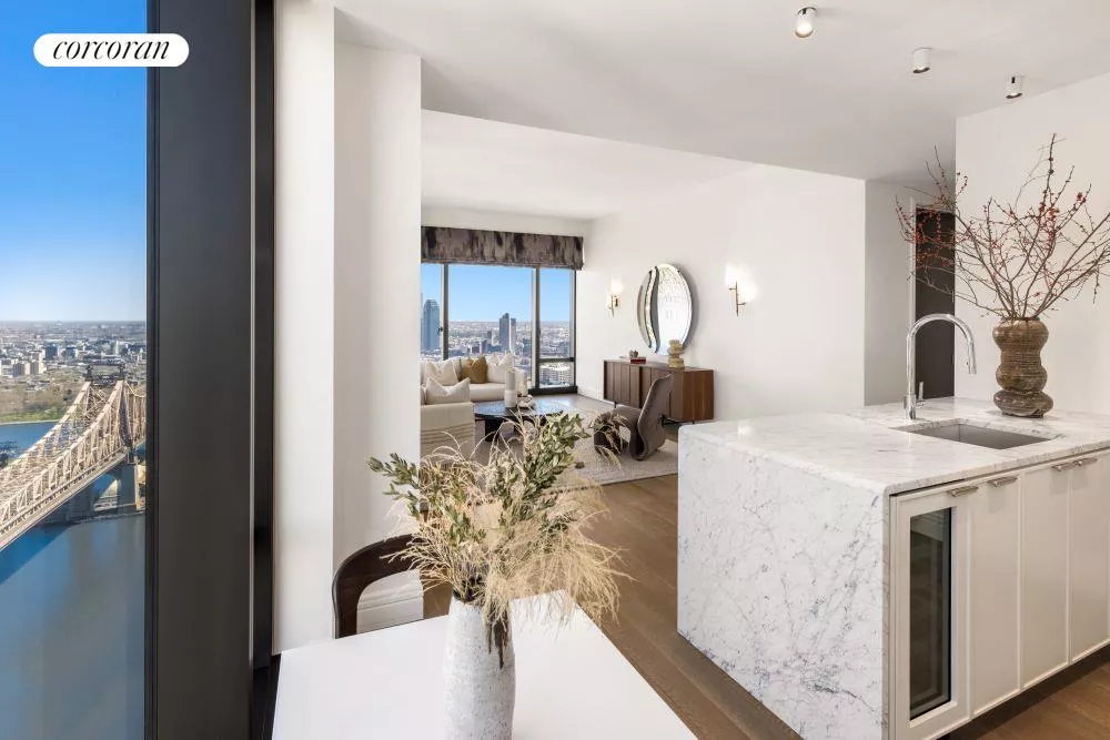 35A is a true showstopper and the highest floor 1BR / 1.5BA. The entry gallery with an adjacent powder room leads to a sundrenched corner living room with direct views of the legendary 59th Street Bridge and beyond while framed by massive floor-to-ceiling windows and high ceilings (10' 3"). The primary bedroom has open northwest views spanning from the iconic San Remo Towers to the Carlyle Hotel.