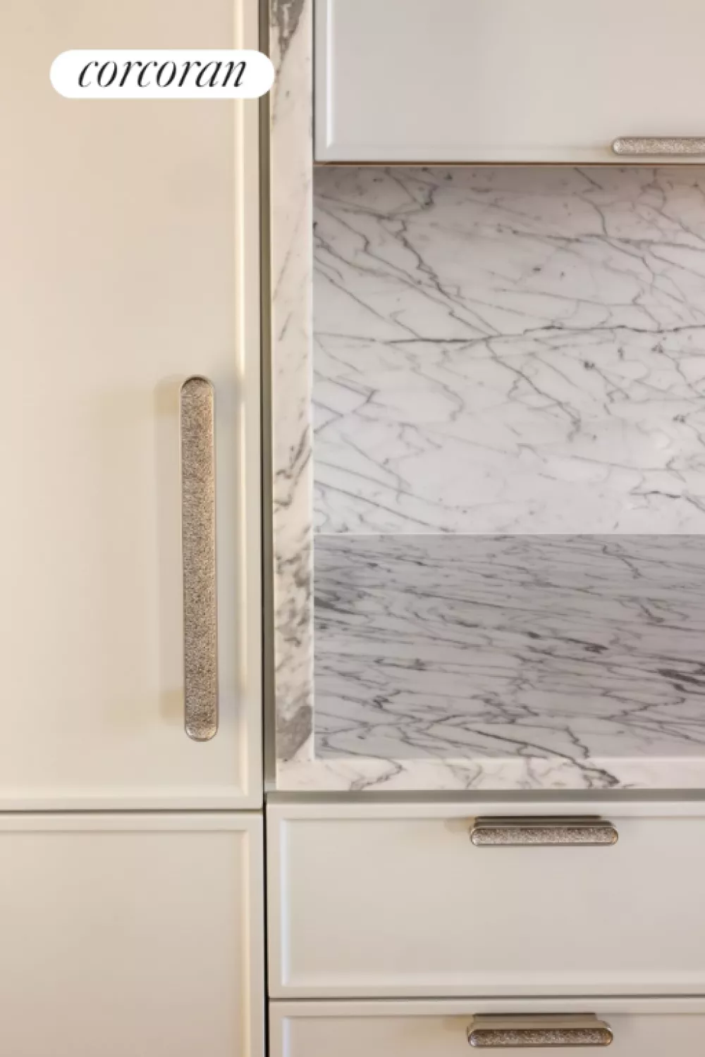 Architectural designer Thomas Juul-Hansen unites elegant design with timeless materials and meticulously executed detailed interiors. An open-concept kitchen with custom Italian white lacquer cabinetry framed with slabs of honed Statuarietto marble, which is also used for the countertops, backsplash, and waterfall island. The state-of-the-art kitchen appliances are Sub-Zero / Wolf. Additional features include a vented cooktop, wine refrigerator, and Insinkerator disposal.
