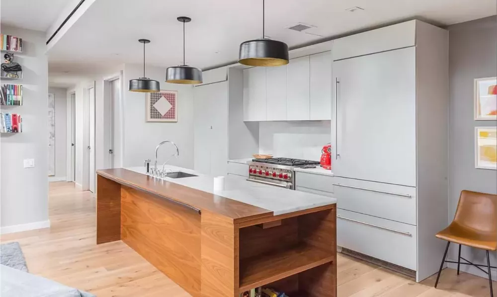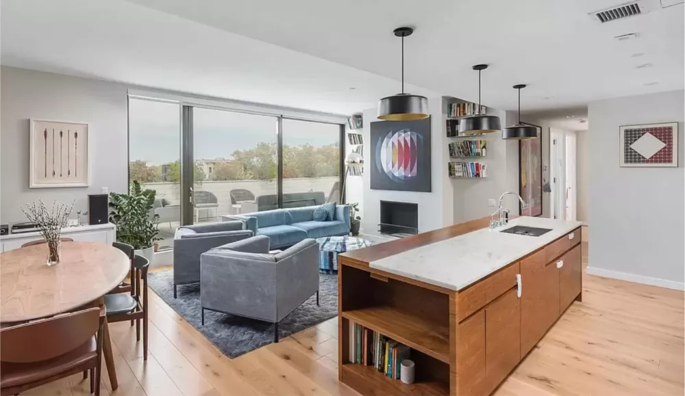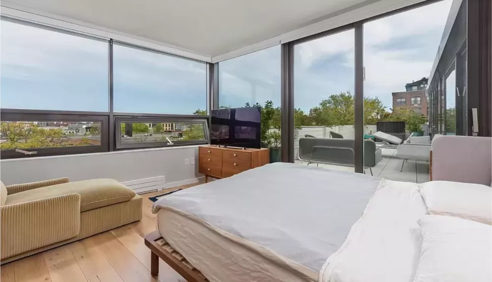 This unique top floor, three bedroom, two and a half bathroom penthouse boasts 1,688 square feet of interior space and 1,530 square feet of total outdoor space split between a sprawling private roof deck with panoramic views of the city and an expansive terrace landscaped by acclaimed horticulturist Patrick Cullina which can be accessed from every room. Enter through the vestibule, which leads into an expansive 600 square foot seamless living, dining and kitchen with an Ecosmart fireplace as the focal point. The airy open gourmet kitchen is an ideal place for entertaining and features an oversized Olympian Danby marble topped center island accented with walnut bar top and under counter custom shelving complemented by hand-crafted wood grain pendant light fixtures, custom-designed by local craftsman Brendan Ravenhill. Additional kitchen features include a Julien sink, Dornbracht fixtures, custom Italian cabinetry and pantry, Wolf 36 gas range with a high-powered, externally vented hood, Miele dishwasher, and Liebherr refrigerator and freezer. Enjoy al fresco dining on the adjacent terrace complete with Weber gas grill or access your private roof terrace above via a staircase off of the dining area.