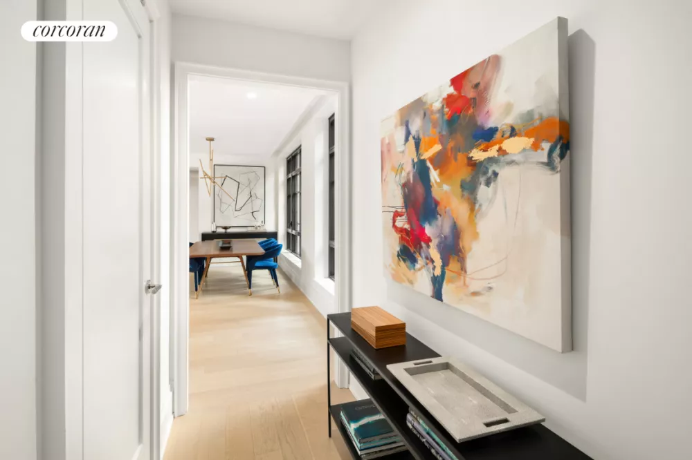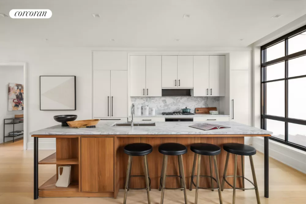 Fine finishes include wide plank Italian oak flooring, 9" decorative mouldings, and oversized casement windows accented with Juliet balconies. Upon entering the windowed foyer with powder room and walk in closet, one continues to the open living dining kitchen area with a wall of windows on each side. The kitchen offers a cantilevered island featuring custom cabinetry and shelving with an overhang for seating in a choice of either walnut or white lacquer finish packages with Calacatta Gold marble countertops and backsplash. A Miele refrigerator/freezer, dishwasher and U-line wine refrigerator are concealed behind custom paneling. A five-burner Miele gas cooktop with vented hood, speed oven, and full size oven complete the range of appliances. A washer and vented dryer provide added convenience.