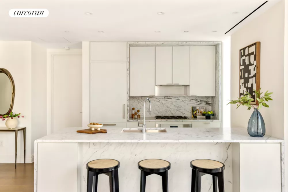 The north-facing primary bedroom boasts ample closet space, an en-suite bathroom elegantly ornamented with Bianco Dolomiti and Calacatta Gold marble, and Toto Neorest water closets. The secondary bathroom is embellished with an Italian custom-crafted lacquer wood vanity, honed cloudy mist marble floors and shower walls, glacier white Corian countertops with integral sink, and a Duravit water closets. Residence features include 5 solid oak plank quartered and rifted flooring, 4 pipe HVAC for year-round climate control.