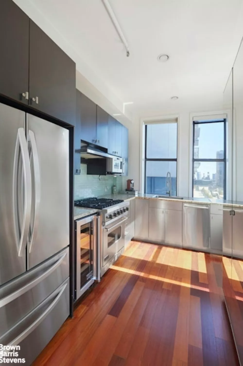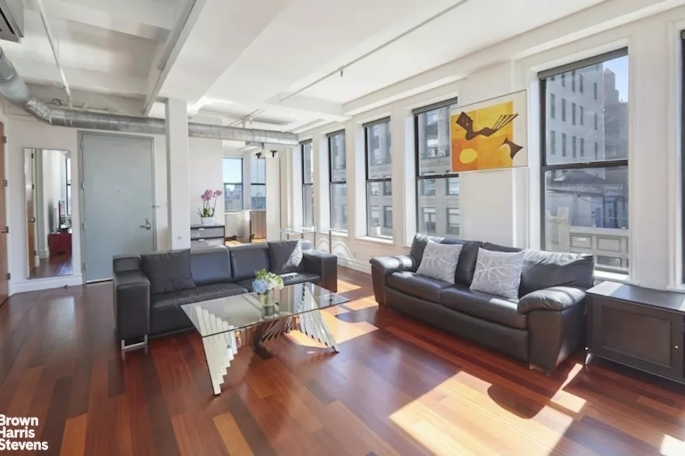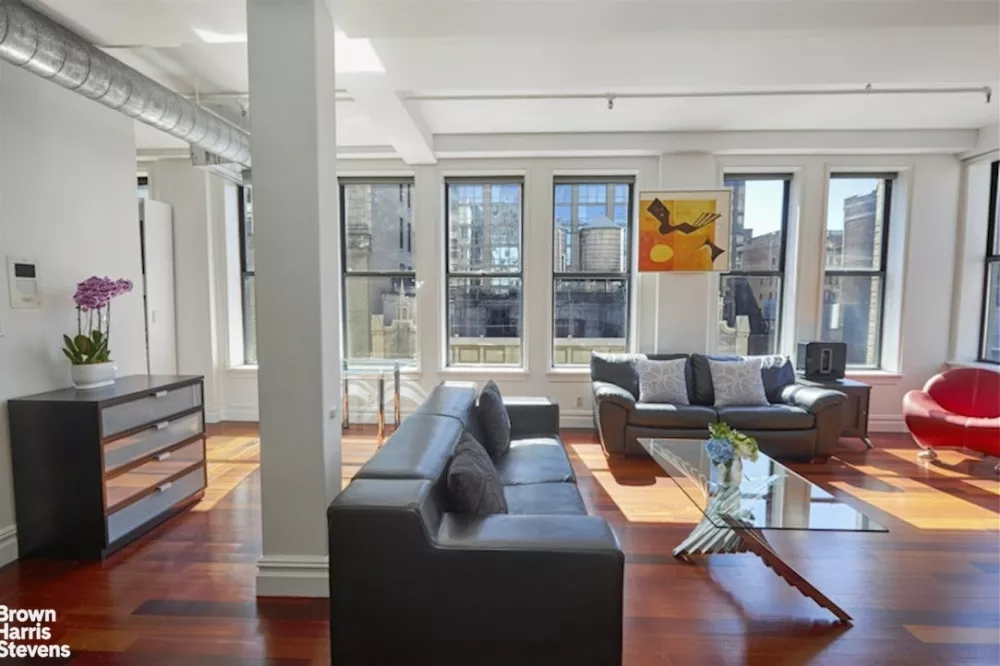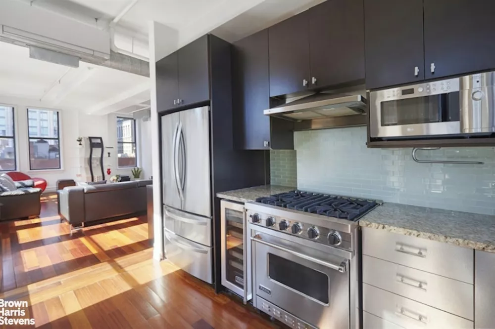 The great room of this NoMad loft boasts 13 open windows, 11 foot tall ceilings, wide-plank Brazilian cherry wood floors throughout and a chef's kitchen. This space is the perfect setting to entertain & lounge while gazing at the city lights. The sunny kitchen boasts Viking & Bosch appliances, as well as custom cabinetry providing intelligent storage solutions, honed stone countertops and subway tile backsplash.