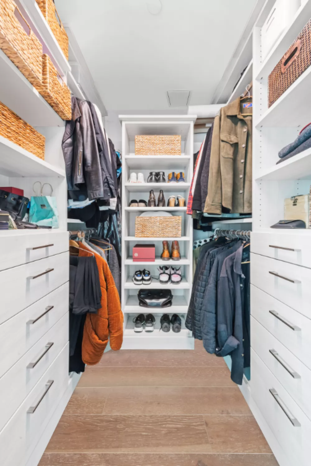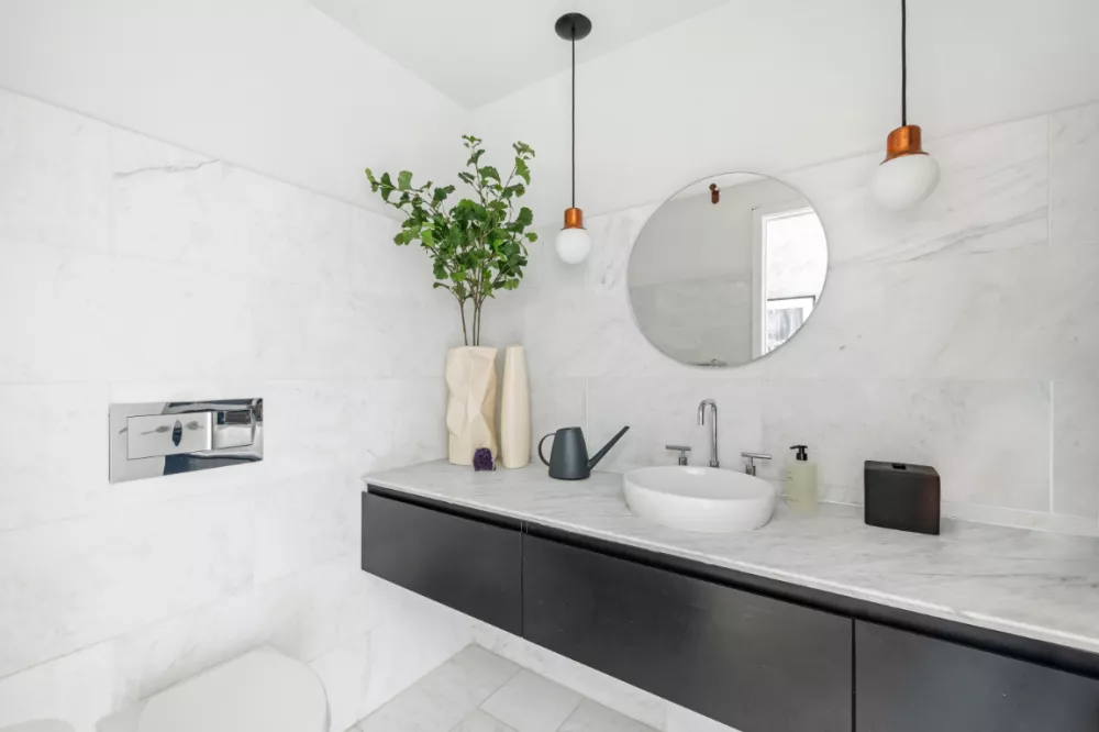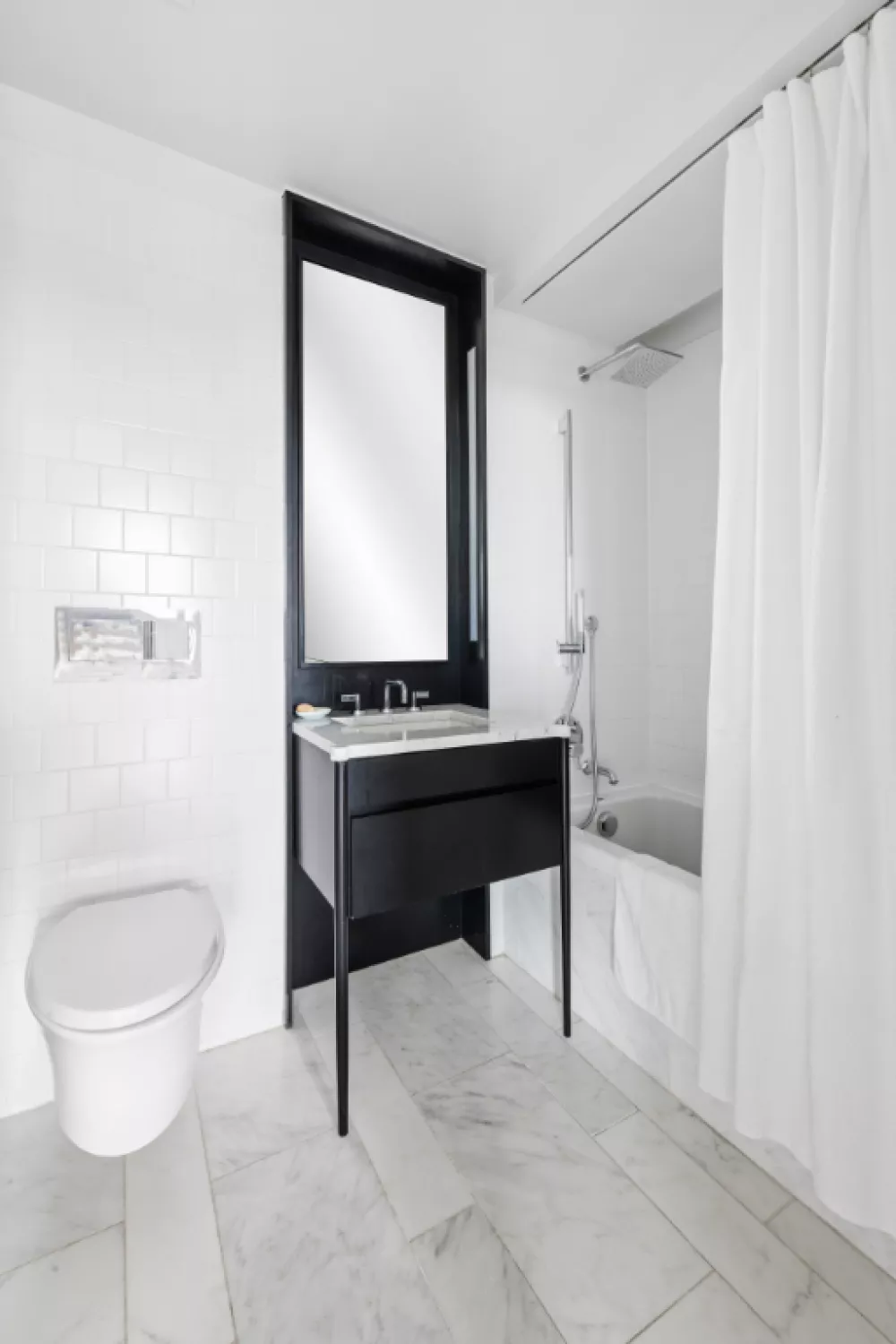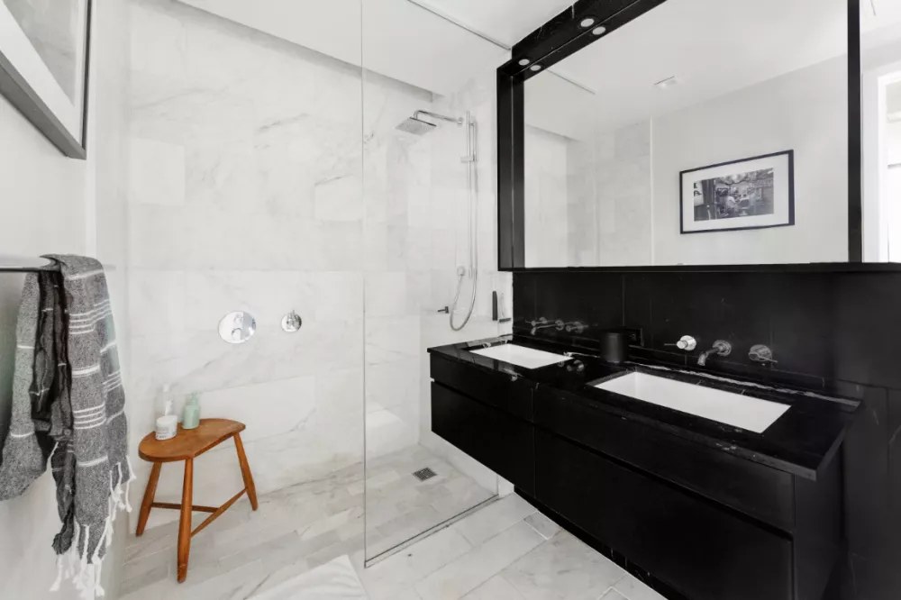 A lovely staircase leads up to a pair of sun-splashed bedrooms separated by a sky bridge with glass railing. The primary suite features a walk-in closet and a spa-inspired en-suite bathroom wrapped in Carrara and Nero Marquina marble tiles. Additional finishes include a floating double vanity, wall-mounted Hansgrohe faucets, and a walk-in rainfall shower. The second bedroom has a large reach-in closet and a full en-suite with chic fixtures and finishes.