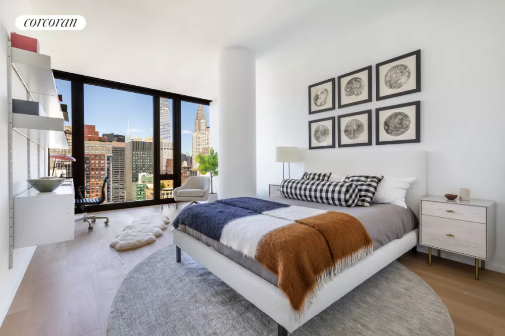Designed by Meier Partners, the residence interiors are a striking contrast to the black glass exterior, reflecting a white color palette. Living spaces are immersed in natural light radiating through the floor-to-ceiling windows. White oak floors are found in all residences and open kitchens boast white Calacatta Lincoln marble counters, Dornbracht fixtures and Gaggenau appliances clad in custom-crafted Italian white lacquer. Each residence is equipped with a built-in Crestron smart home system that regulates temperature, lighting and the motorized window shades. These functions can be seamlessly controlled by residents through any iOS or Android device.