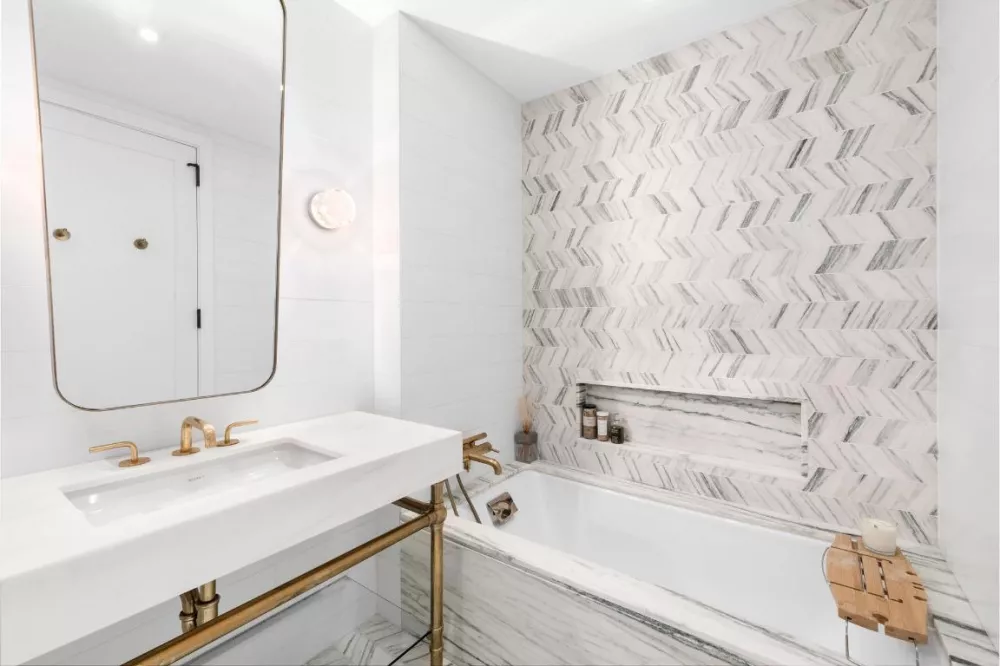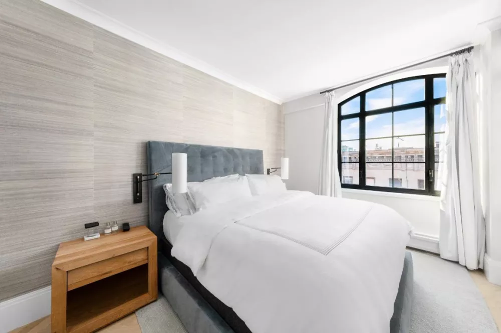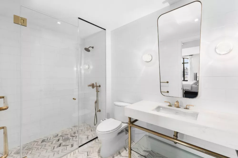 Tucked away, the Primary Bedroom suite features dual exposures with open serene city views, as well as an impressive walk-in closet. The gracious en-suite spa like bathroom all clad in white Dolomiti marble is bookended by a separate walk in shower and a deep soaking tub featuring brushed brass fixtures by Waterworks completed with radiant heated floors.
