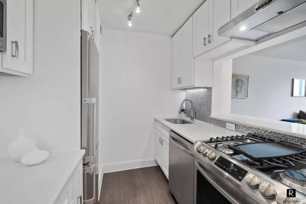 Kitchen: Sleek, modern pass thru kitchen featuring stainless steel appliances, including dishwasher and recirculating hood, quartz countertops, and generous custom cabinetry to meet all your culinary needs.
