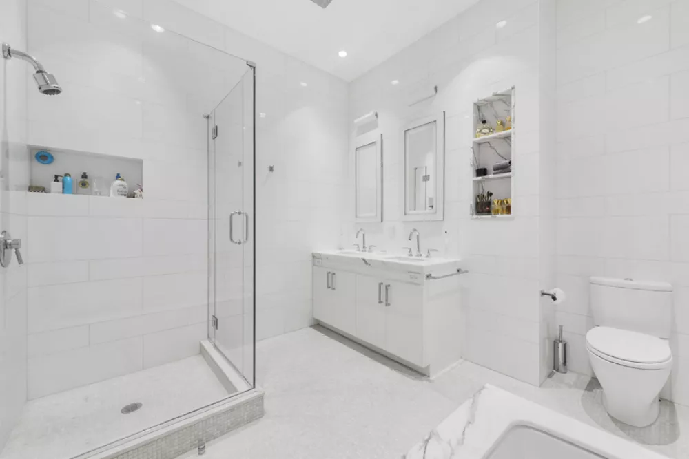 Upon entering the garden level, you’ll find a sleek Poliform-designed eat-in chef’s kitchen equipped with top-of-the-line appliances from Viking, Miele, and Sub-Zero. This beautifully designed space features an island with counter seating, ample storage, and a cozy breakfast nook overlooking the street. Toward the rear, a media room opens into a bright solarium with access to a south-facing garden. The garden, complete with a patio and a Viking grill, is perfect for outdoor gatherings. This level also includes a powder room and a laundry area for added convenience.