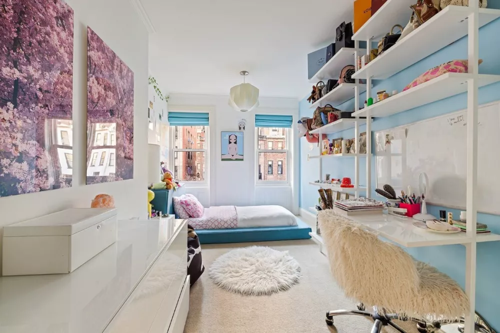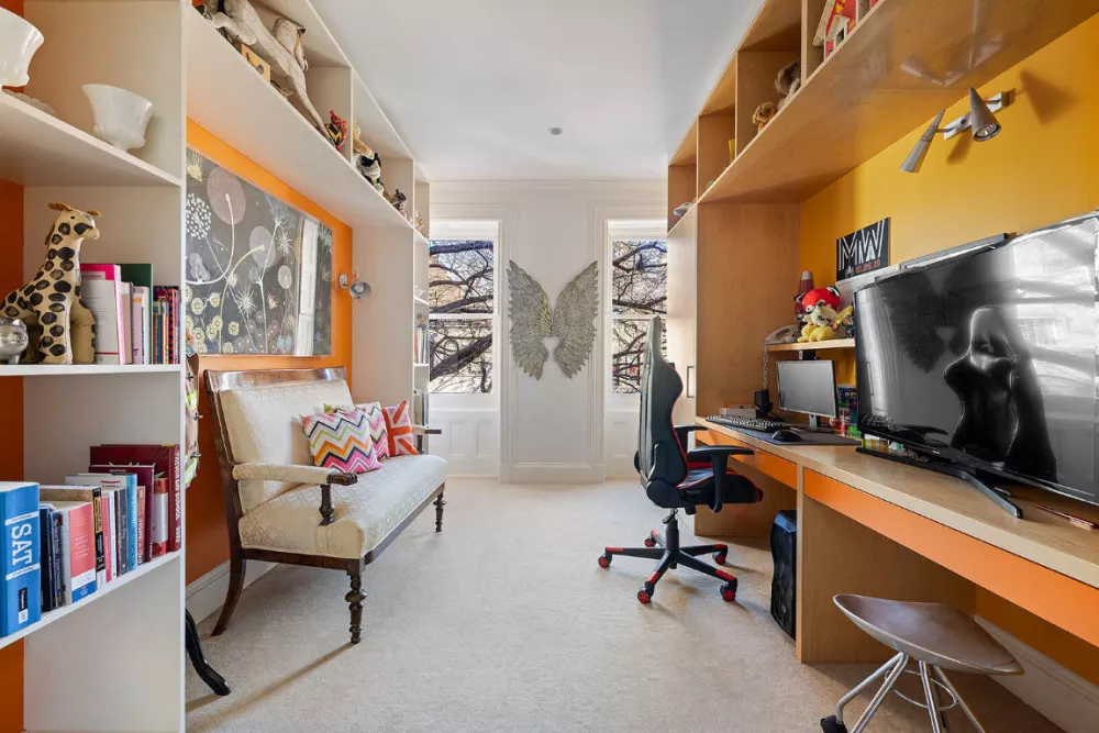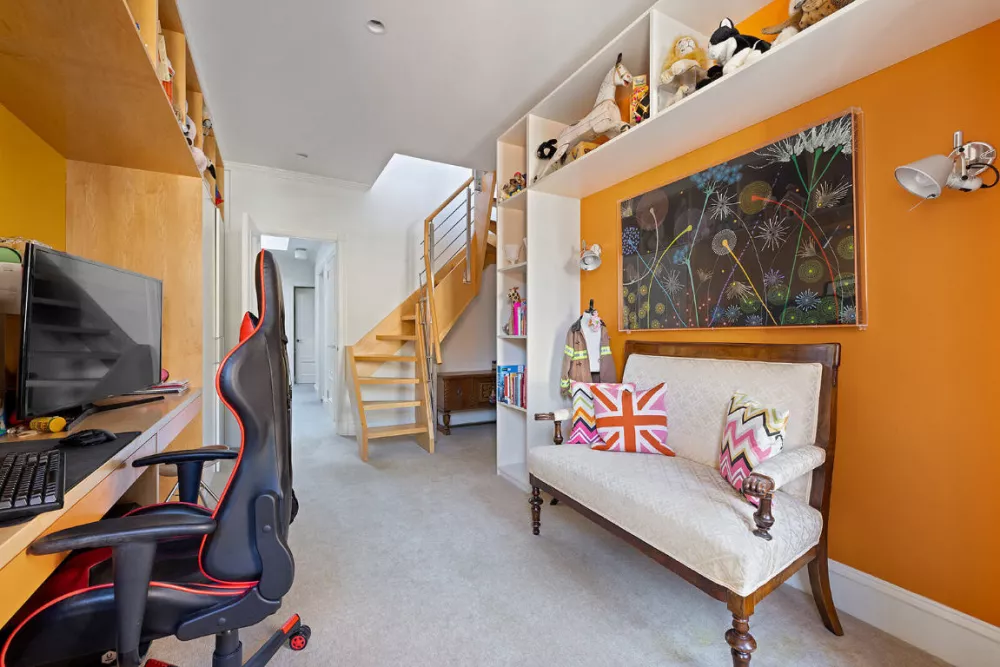 The fourth floor provides two bedrooms at the rear and a shared full bathroom in the hall. At the front of the floor, a spacious playroom connects to another bedroom and full bathroom, with a charming wooden staircase leading to a unique loft space. The loft, with its slanted skylights and natural light, offers a versatile area for an extra bedroom or studio.