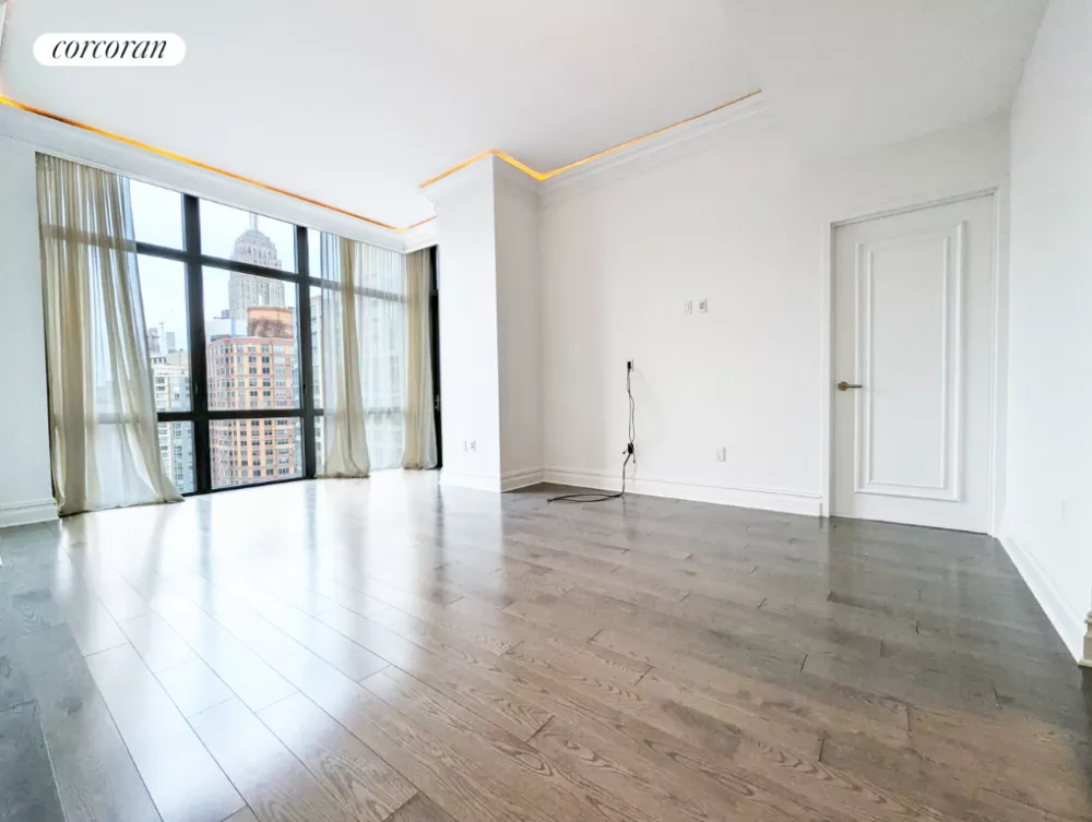 Spanning 1,113 square feet, this sun-splashed high-floor home shines with 10-foot-tall ceilings, new flooring, freshly painted, and floor-to-ceiling windows along the northern and eastern exposures. A tiled foyer with a walk-in coat closet ushers you into the spacious living room, featuring a generous footprint for seating and dining areas flanked by glorious views of the Empire State Building and Midtown skyline. In the well-appointed open kitchen, zebrawood cabinetry and stone countertops surround stainless steel appliances, including a gas cooktop, oven, bottom-freezer refrigerator, dishwasher, and built-in microwave. Enjoy casual meals at the breakfast bar or step onto the 12-foot-long balcony for morning coffee or after-dinner drinks overlooking the bustling city below.