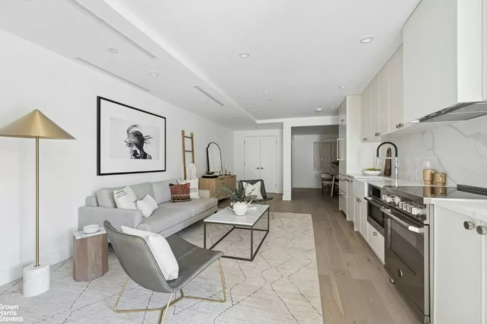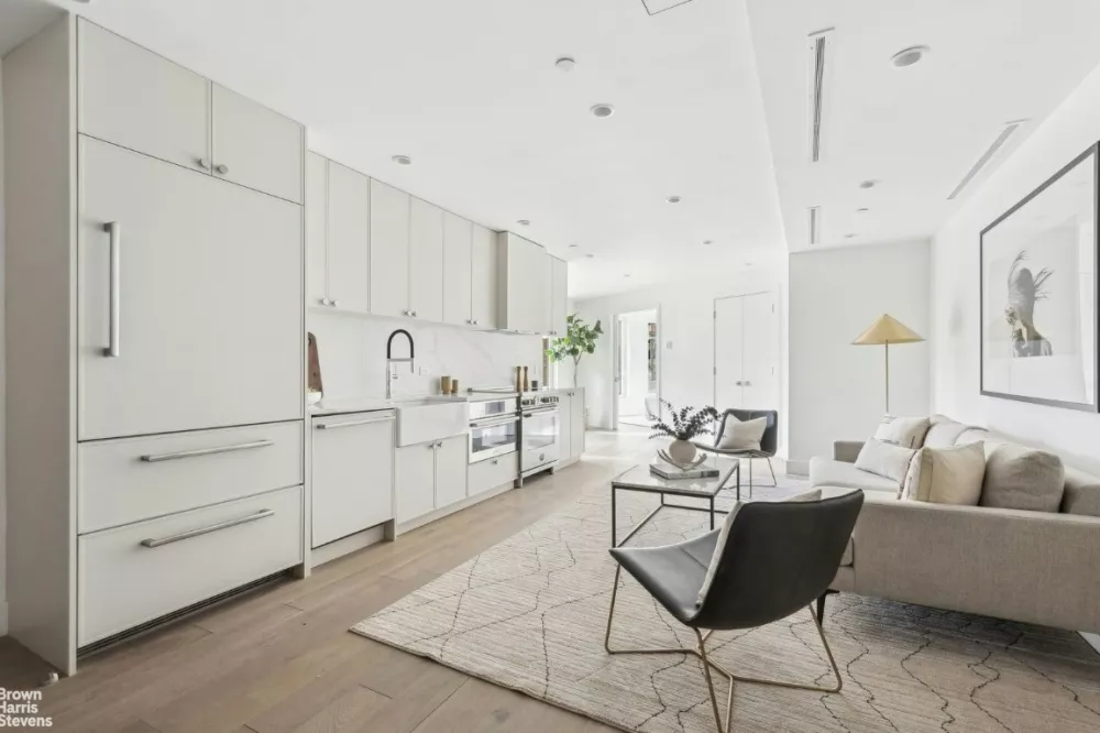 Residence 1A epitomizes luxury living, boasting European white oak engineered wood floors and surface mount bedroom light fixtures that accentuate the modern ambiance. On the main floor, the gourmet kitchen is a culinary enthusiast's dream, featuring white quartz countertops, painted wood shaker cabinetry, and panel-ready appliances seamlessly integrated for a sleek aesthetic. Enhancing the culinary experience, a ceramic farmhouse sink caters to the most discerning tastes, while top-of-the-line appliances including a Liebherr 36" refrigerator and freezer, Bertazzoni induction range, and Bosch fully-integrated dishwasher elevate every meal preparation. The expansive living/dining space provides the perfect backdrop for entertaining guests or simply unwinding in style.