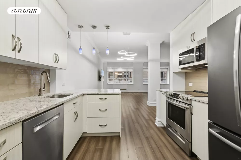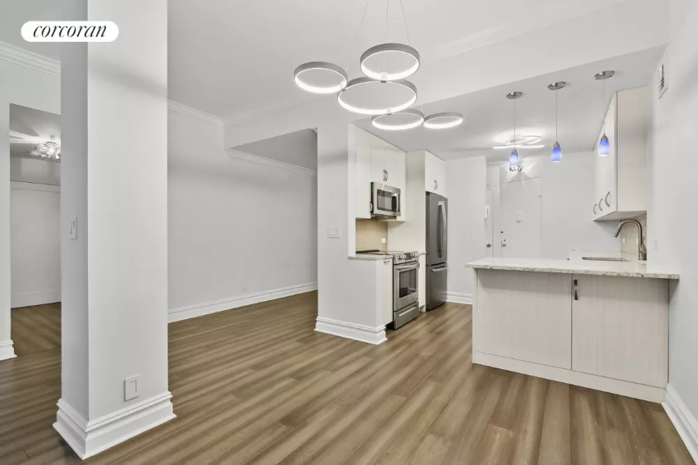 The kitchen has been completely reimagined with brand-new appliances, widened hallways, and exquisite wood plank floors that complement the 9.5-foot ceilings and crown molding. Thoughtfully redesigned closets and custom doors offer both style and function, while the home office space provides flexibility-convert it into a third bedroom with board approval!