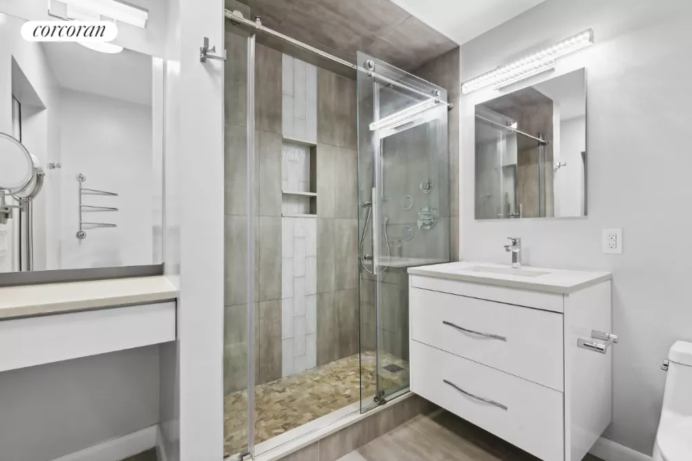 The primary bedroom is a true retreat, spacious enough for a king-sized bed and featuring two large closets. The En-suite bathroom pampers you with multiple Kohler shower heads and soothing Riverstone flooring, creating a spa-like oasis. The second king-sized bedroom connects directly to the powder room, outfitted with a tub and Hansgrohe fixtures, which is also conveniently accessible from the hallway. With five additional closets throughout the apartment, storage will never be an issue.