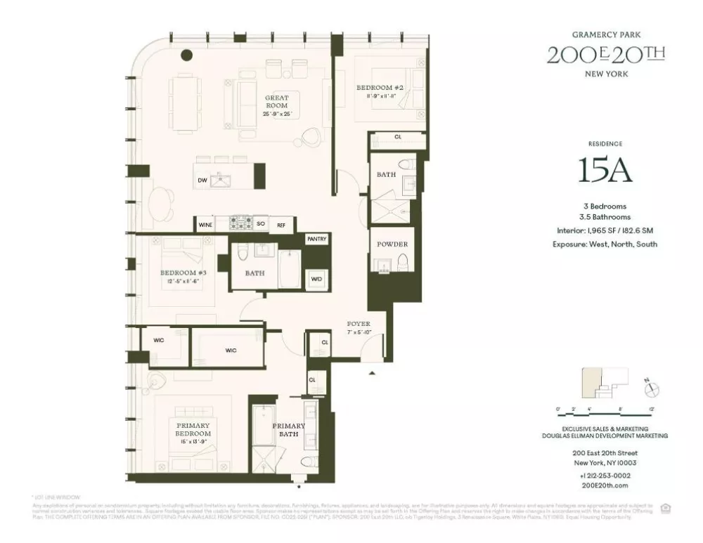 This one of a kind three-bedroom, three-and-a-half-bathroom residence features northern, southern and western exposures, showcasing panoramic windows, 9'8" ceilings, and Italian White Oak 6 inch wide-plank flooring. Including a captivating skyline view of Manhattan and Gramercy Park. Enjoy the added luxury of a private balcony. The VRF heating and cooling system ensures personalized comfort. Laundry closets, equipped with Miele washer and dryer, add convenience. Elegant neutrals pervade the Primary Bath palette. Cream-colored Perla Venata Quartzite stone floors set off the elegant Bianco Dolomiti marble walls, countertop and tub deck. A custom Tambour fluted wood-veneer vanity with blackened steel-frame mirrored medicine cabinet create pleasing shapes and lightly rendered lines that are in keeping with building's tightly tailored aesthetic. The theme of delicate tactility continues in the Secondary Bath, with finely grooved sandy white ceramic tiles lining the walls, with Alfalux 2" square Italian made Torbole matte finish mosaic tile at the shower walls. Floors feature Alfalux Torbole ceramic tile, with a custom white lacquer vanity and Krion countertops in Snow White. A study in subtlety, the Powder Room walls are covered in grey Xtone Fiori di Bosco large, polished marble tiles. The moody shade of the custom Grafite honed marble stone slab vanity completes the composition.