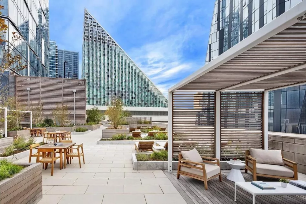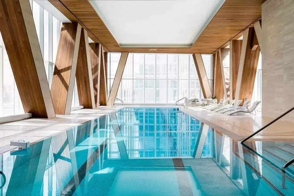 One West End was designed by Pelli Clarke Pelli with over 35,000 square feet of indoor and outdoor resort-inspired amenities, including a 75-foot swimming pool set within a double-height cantilevered atrium, a private fitness center and spa, and a 12,000 square foot terrace boasting cabanas, lush green spaces, and areas for grilling and outdoor entertaining. Additional resident spaces include a living room with a fireplace, media room, billiards and game rooms, a playroom overlooking the garden terrace, and a private dining room with a chef's demonstration kitchen. On-site parking and resident storage are also available, rounding out the unparalleled living experience at One West End.
