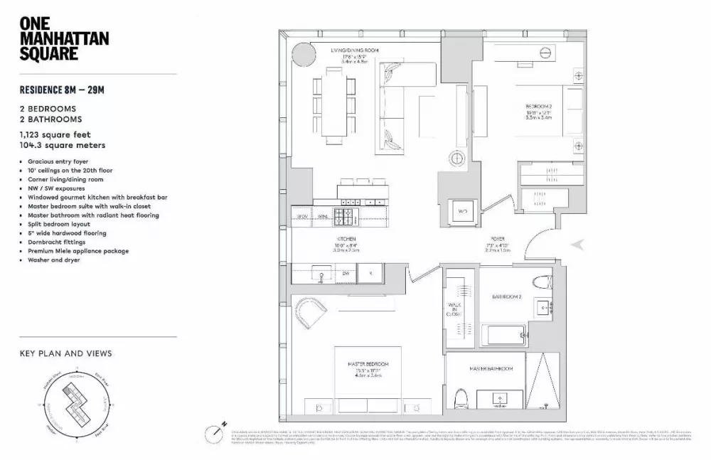 Residence 24M is a 1,123 square foot two bedroom, two bathroom with an open gourmet kitchen and breakfast bar. This spacious corner residence faces North West and South West, with NY Harbor views and expansive City Skyline. Warm, modern interiors are brought to life by the renowned design team at Meyer Davis Studio. This residence features imported stone and custom finishes, premium Miele appliance package, 5" wide stained oak flooring, master bath with custom wood cabinetry, marble tile walls and mosaic floors with radiant heat, undermount Wetstyle sink with glass vanity top and Dornbracht polished chrome faucets and a washer and dryer.