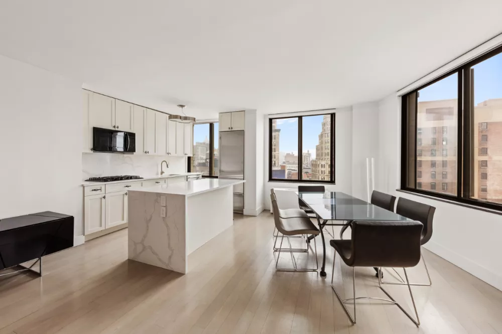 Exquisite corner 2-bedroom, 2-bathroom home with split-wing layout and 6x9 balcony, saturated with natural light through oversized windows facing south and west that capture city skyline views. Well-appointed and expertly designed open kitchen, outfitted with breakfast bar, custom white cabinetry, Silestone faux marble countertops, stainless appliances and a Subzero fridge. Generous rooms include a 20X14 master bedroom and a 20 X11 second bedroom, two pristine bathrooms, three large organized closets, City Proof soundproof interior windows and handsome bleached maple wide plank flooring throughout. Madison Green is a coveted F/S condominium, well-established and financially stable, centrally located on treelined Flatiron block, next to the iconic Flatiron Building in one of the most central and dynamic downtown neighborhoods, steps from Madison Square Park, Shake Shack, Eataly, Union Square farmer's market and Fifth Avenue shopping. The R/N train is right outside our door and the F/M/6 trains are a block away. Amenities include 24-hour doorman and concierge, resident super, on-site managing agent, fully equipped 24-hour complimentary fitness center, laundry room on every floor with two washers and two dryers, Madison Club resident lounge with wifi on the 30th floor with stunning Park and city views, a 24-hr parking garage, a valet for dry cleaning and wash & fold, and an ATM in the double-height lobby with views of the landscaped garden. I am a resident broker.