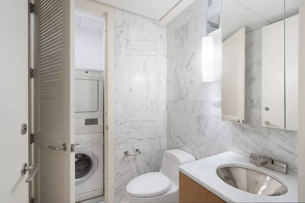 The modern kitchen is equipped with sleek stainless-steel countertops, custom glass cabinets, and a suite of high-end appliances by Miele and Sub-Zero. Ideal for entertaining, the kitchen can be concealed with sliding doors. The gracious bedroom is well appointed with two large closets, and a luxurious five-fixture marble en suite bathroom. A guest powder room with a Bosch washer/dryer is discreetly tucked away.