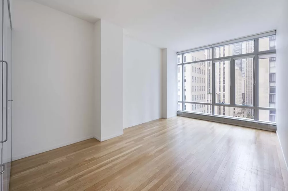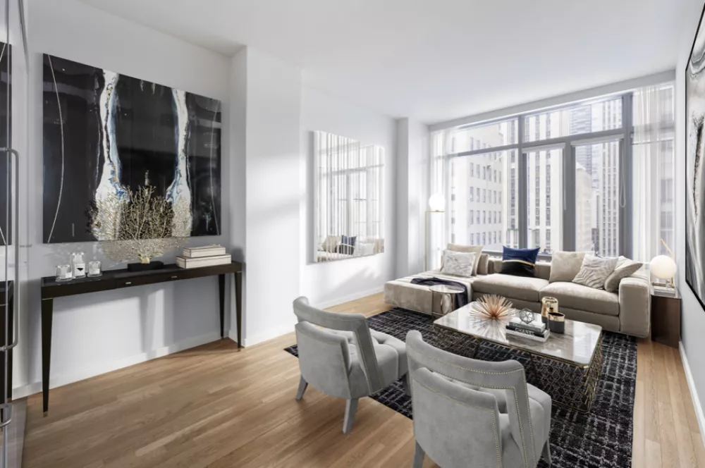 Apartment 15E is a pristine 1-bedroom, 1.5-bath contemporary home with floor-to-ceiling windows and direct views of Rockefeller Plaza. Fabulous features include rich hardwood floors, a grand living/dining room, kitchen with top-of-the-line stainless steel appliances, a large bedroom with an en-suite five-fixture bathroom, a separate guests' powder room, and a washer/dryer.